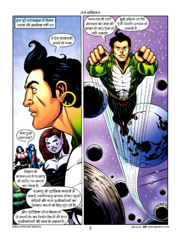 The very first pages of the issue show a great battle. There is a fierce battle between the goddesses ‘Shakti’ and ‘Vikrit’ (in the body of Parmanu). The author has shown the clash of the great form of ‘Shakti’ and the demonic powers of the pervert in a very interesting and powerful manner. Dhruva and Nagraj watch this war and understand that it is difficult to defeat the pervert directly because he is shielding the body of Parmanu.