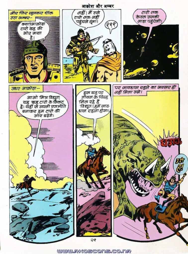 The story reaches its climax when Amber comes to Earth and directly attacks Aakrosh. At that time, Aakrosh is already fighting the terrible monstrous creatures. Aakrosh is also shocked to see Amber’s tremendous strength and technique. There is a fierce and memorable battle between the two, where on one side there is high-tech machinery, and on the other side there is bravery and moral strength. Eventually, Aakrosh succeeds in convincing Amber of the truth—that they have both become victims of Khataro’s plot. The story ends with the hope and determination that now together they will end their real enemy, Khataro.