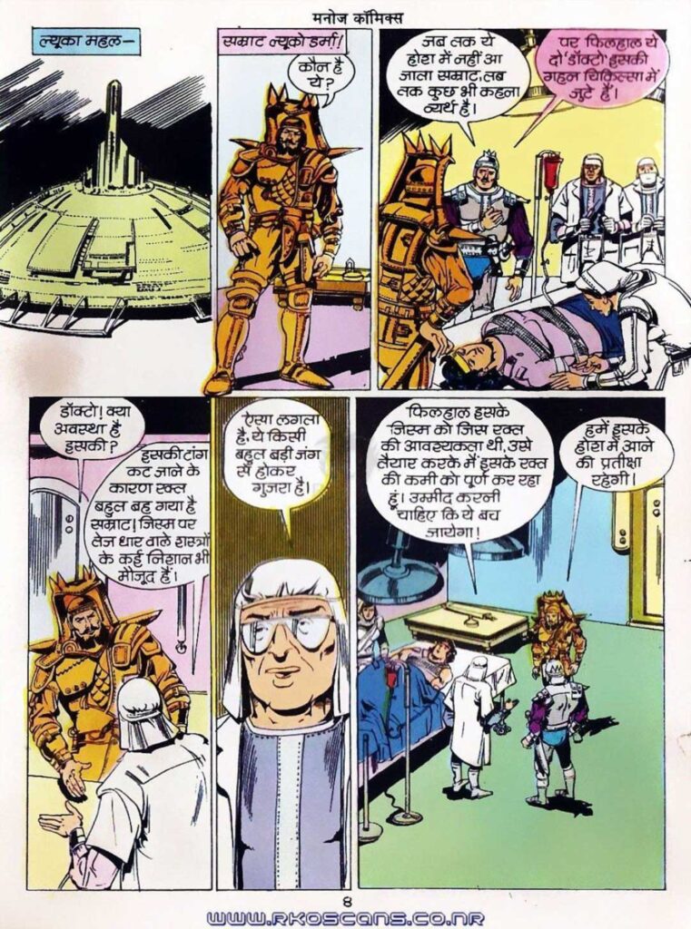 The credit for the brilliant painting of this comic goes to Dilip Kadam and Jaiprakash Jagtap. They have shown the scenes of the planet Leuca, machines, labs, and space in great detail, just like any space-opera movie. The action scenes show tremendous energy, especially when Amber uses lasers and chain-weapons with his crutches. The artists have also depicted emotions like the pain of defeat, physical pain, and the glow of revenge on Amber’s face very effectively.