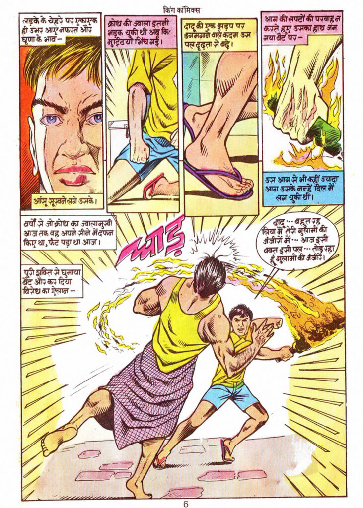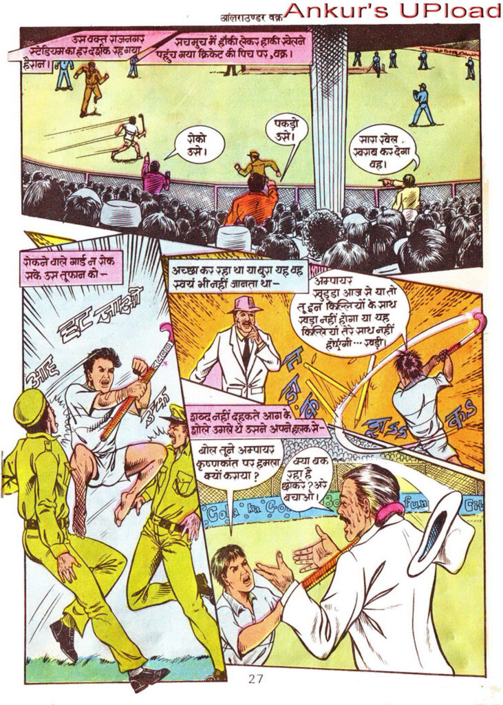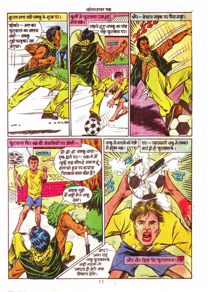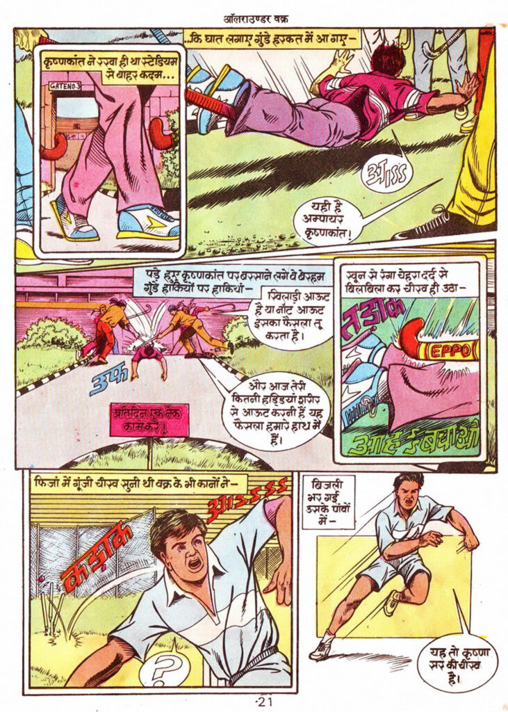 कला (धीरज और वर्मा): धीरज की पेंसिल और वर्मा की फिनिशिंग उस युग के हिसाब से बेहतरीन है। कला ‘ग्रिटी’ (gritty) है, जो कहानी के डार्क टोन से मेल खाती है। वक्कू के चेहरे पर गुस्सा, बेबसी और दर्द के भाव बहुत स्पष्टता से दिखाए गए हैं। एक्शन सीन (वक्कू का फुटबॉल से लड़ना, या हॉकी स्टिक से गुंडों की पिटाई) बहुत गतिशील और प्रभावी हैं। वक्र का कॉस्टयूम थोड़ा अजीब लग सकता है (क्रिकेट गियर पहनकर लड़ना), लेकिन यह उसकी थीम और उसकी पहचान “ऑलराउंडर” से पूरी तरह मेल खाता है।