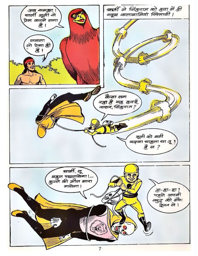 कहानी में असली ट्विस्ट तब आता है जब चार्ली, जूनी को इंप्रेस करने और अपनी बहादुरी दिखाने के लिए, सिंहराज को खुद सज़ा देने का निश्चय करता है। वह सिंहराज को रस्सियों से आज़ाद करता है और अपनी जेट-पैक जैसी मशीन से उसे हवा में घुमाकर खूब परेशान करता है। आखिर में, वह उसे फांसी पर लटका देता है।