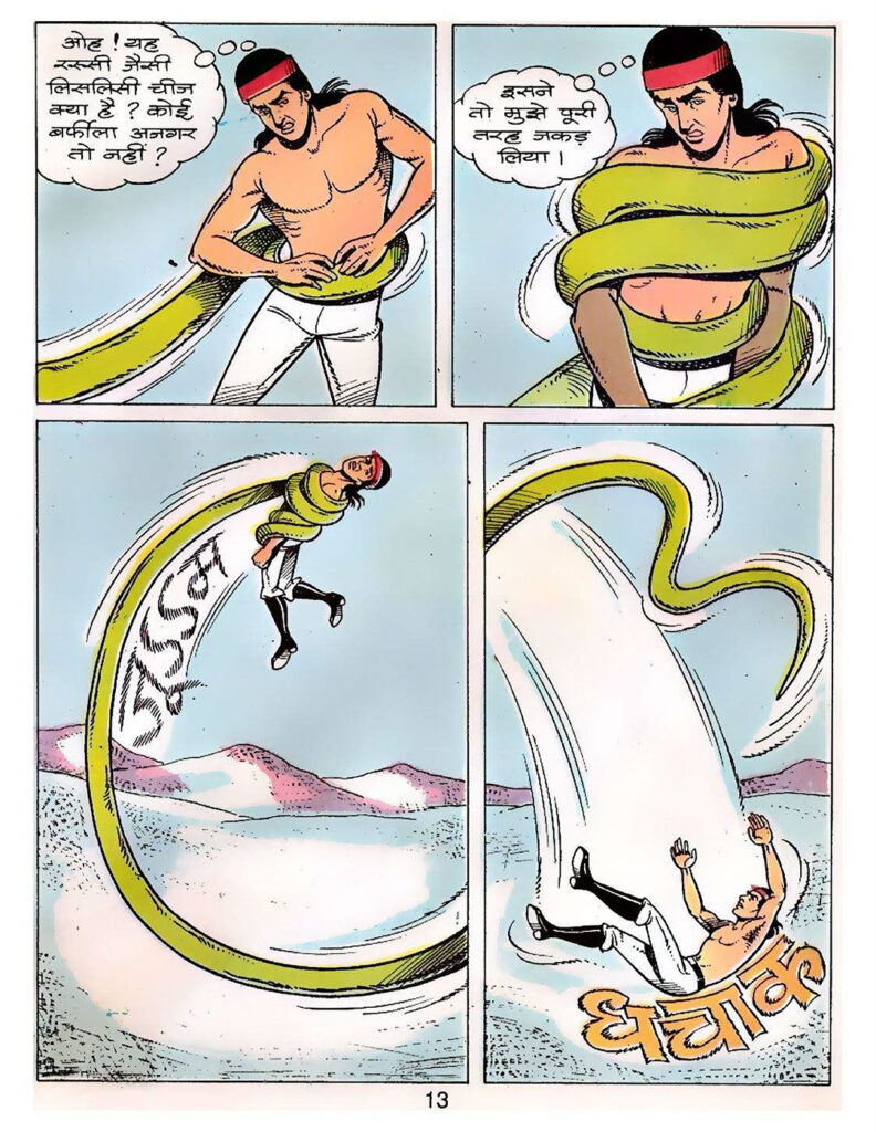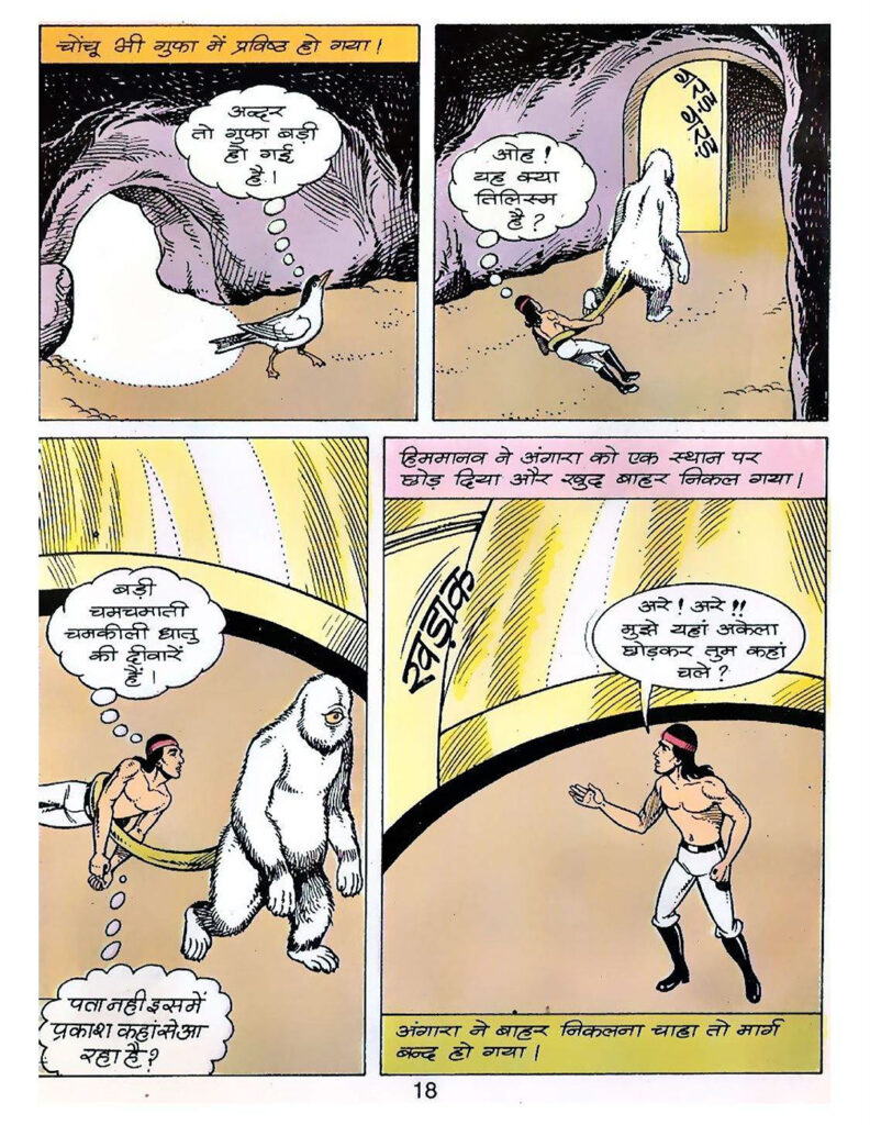कहानी का सबसे रोमांचक हिस्सा तब आता है जब अंगारा उस रहस्यमय हिममानव का पीछा करता है। हिममानव की पूंछ बहुत लंबी और बेहद ताकतवर है। वह अंगारा को अपनी पूंछ में कसकर जकड़ लेता है। यहाँ पाठकों को बड़ा झटका लगता है, क्योंकि हाथी जैसी ताकत रखने वाला अंगारा भी इस हिममानव के सामने बेबस नजर आता है। हिममानव अंगारा को खिलौने की तरह घुमाता है और उसे अपनी गुफा में घसीट ले जाता है।