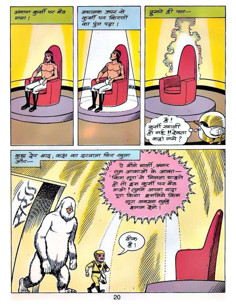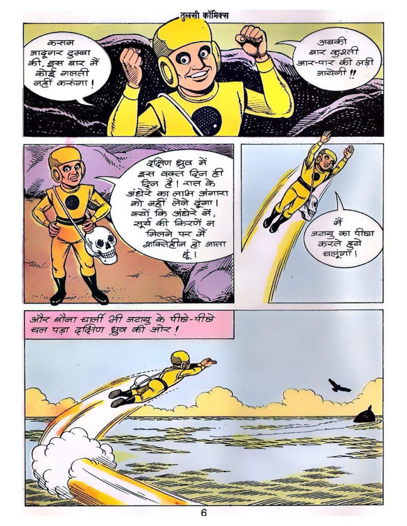 अगर इस कॉमिक्स का असली हीरो कोई है, तो वह जटायु ही है। अंगारा के गायब होने के बाद जटायु जिस समझदारी और ताकत का परिचय देता है, वह सच में तारीफ के काबिल है। एक विशाल हिममानव को दक्षिण ध्रुव से भारत तक उड़ाकर लाना उसकी जबरदस्त शक्ति को दिखाता है। अंगारा के प्रति उसकी वफादारी ही पूरी अंगारा सीरीज की असली ताकत और रीढ़ है।