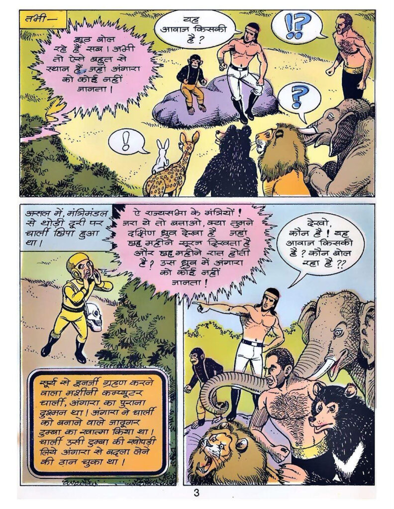 यह आवाज किसी और की नहीं बल्कि ‘बौना चार्ली’ की होती है। चार्ली, अंगारा का पुराना दुश्मन है और जादूगर डुम्बा का साथी रहा है, जिसे अंगारा ने मार दिया था। चार्ली एक मशीनी कंप्यूटर-मानव है जो सूरज से ऊर्जा लेता है। अपने साथी की मौत का बदला लेने के लिए वह अंगारा को एक खतरनाक जाल में फँसाना चाहता है।