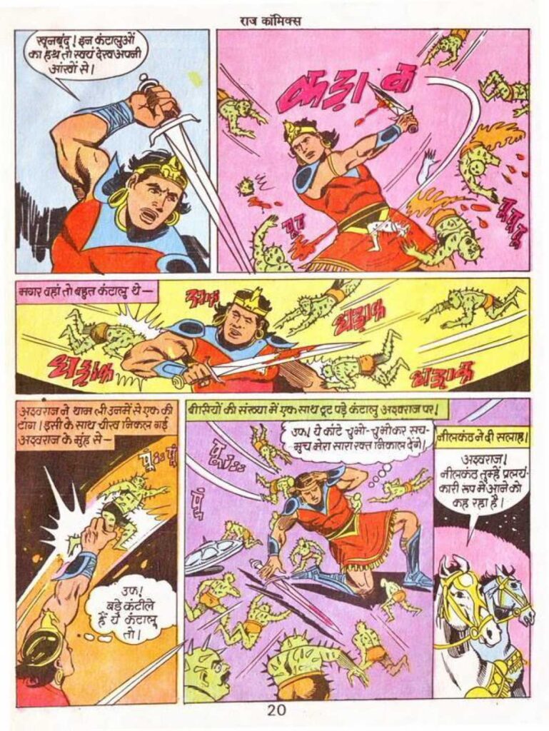 The character of Ashwaraj is the most sophisticated form of the concept of ‘Centaur’ (half human–half horse) in Indian comics. The strength with which Vitthal Kamble has depicted Ashwaraj’s body shows his deep understanding of body structure. The meeting point of the human torso and the equine body has been shown so effortlessly by the artist that it seems completely natural. The blue and red stripes used in the design of Ashwaraj’s armor give him the appearance of a glorious warrior.