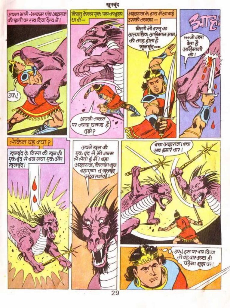 The visual design of the main villain ‘Khoonbund’ resembles a sly and powerful tantrik. Her green royal clothes and crooked facial expressions clearly show her negativity. Her biggest feature is her ‘blood power’, which the artist has shown very effectively. When she transforms into a giant pink dragon, the tearing of her skin and the growth of bones during that transformation are depicted with very scary accuracy. The fine work done in the dragon form, the texture of every part of her body, and her long tail take the level of painting to new heights.
