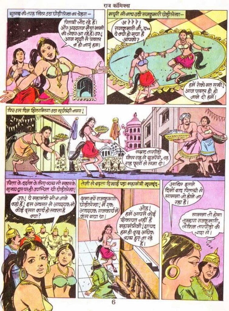 The grandeur with which the architecture of Ashwaloka is shown at the beginning of the comic is truly praiseworthy. The artist has shown it as a city situated amidst the mountains, where the combination of modernity and antiquity is visible. Symbols of horses have been used strategically in the carvings on the walls of domes, tall minarets, and palace buildings. The carvings of chandeliers, carpets, and pillars in the interior scenes of the palace show how hard the artists have worked on the world-building. The depiction of the mountains seen in the background and the clouds covering them gives depth to the scene.