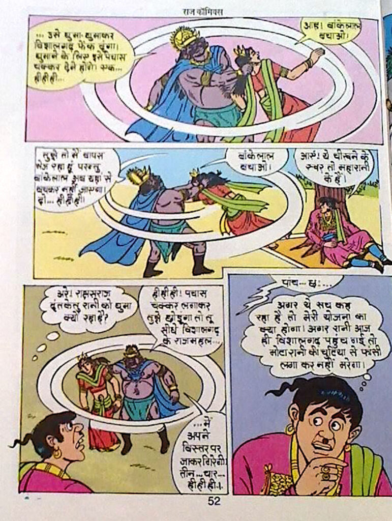 Bankelal: In this comic, Bankelal is seen in his absolutely familiar form. He is not a brave warrior, but a person struck by circumstances. When he is forcibly sent into the boat, he cries, is afraid, and even pleads. His true strength is not his sword or bravery, but his luck and his cunning. Like at one place, two demons fight among themselves to kill him. Bankelal does nothing special there; he just tries to save his life by hiding silently, but in the end, he wins. This timid and common man–like nature of his brings him even closer to the readers, because he seems very “relatable”.