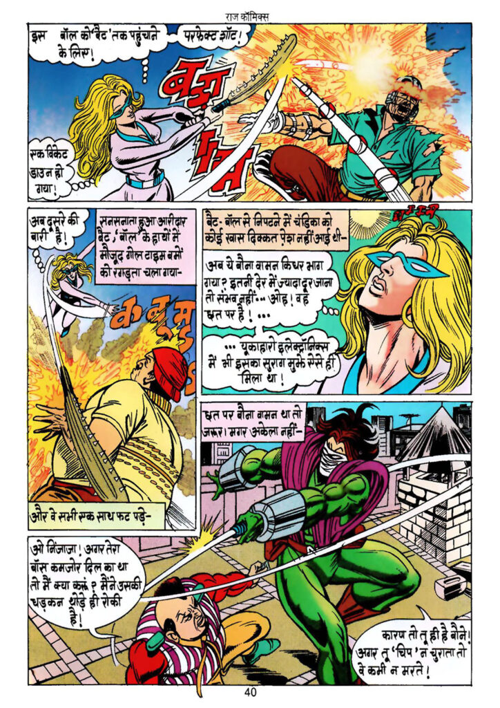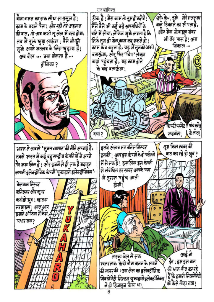 This development takes the conflict of the story to a personal and emotional level. Dhruv not only has to fight a technical criminal but also has to save the life of his friend (possibly Shweta), whose life is in danger because of the chip. The rest of the comic focuses on this technological threat, Dhruv’s quick action, and his decisive confrontation with the Bauna Vaman and Tronica.