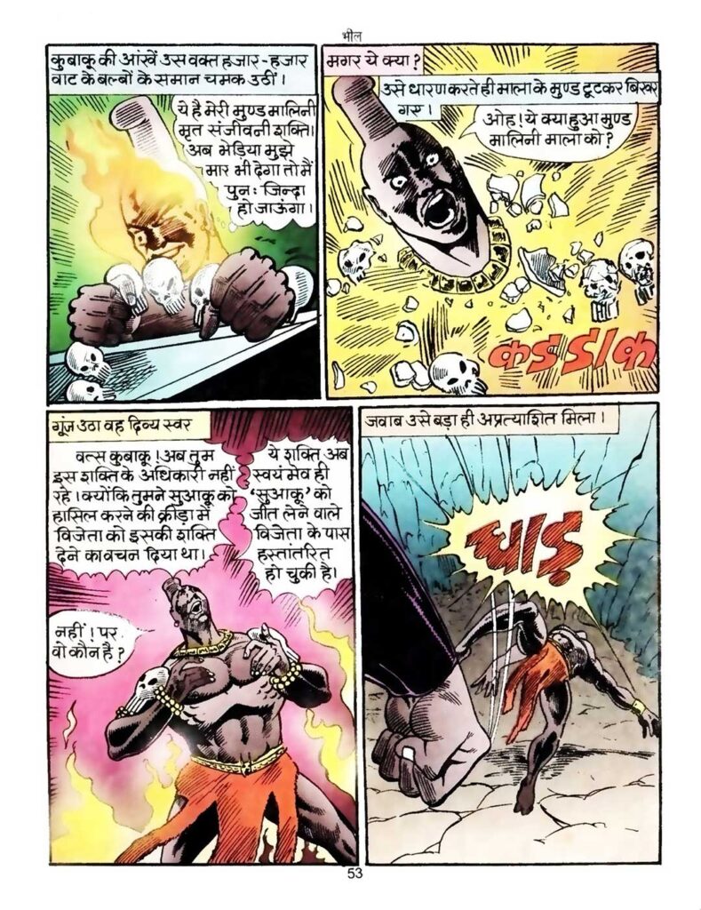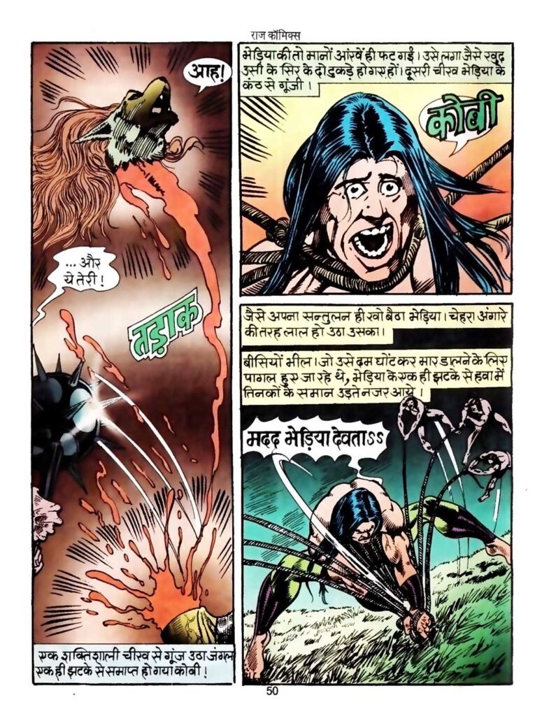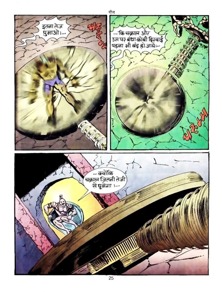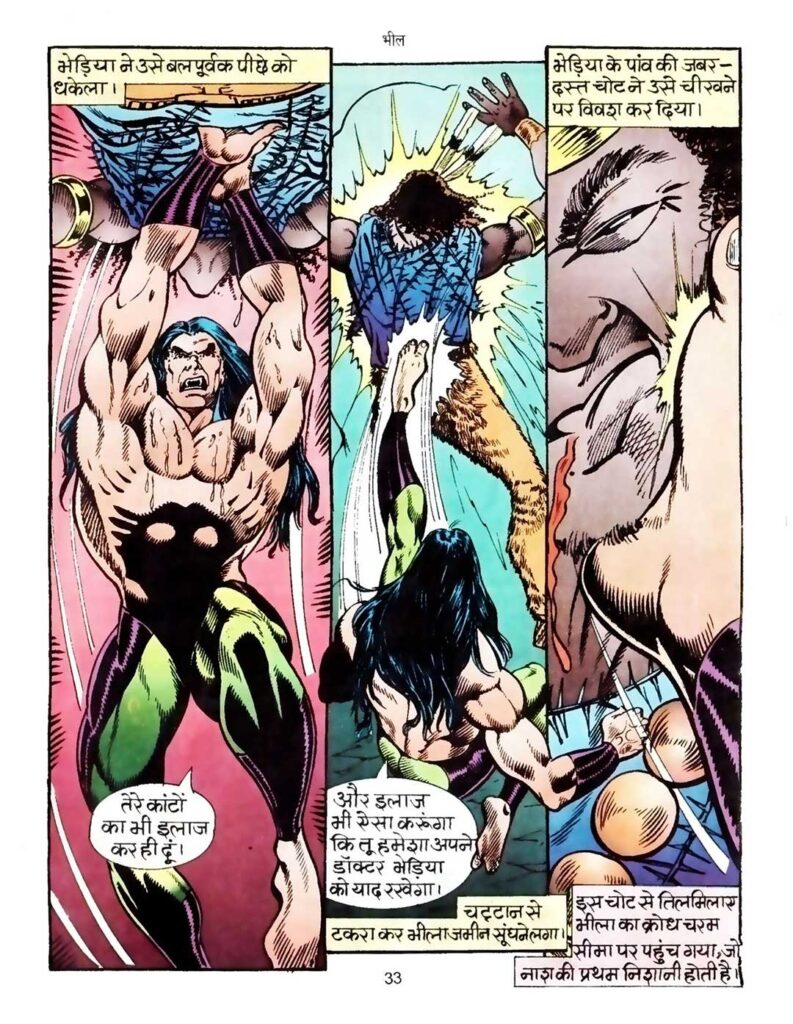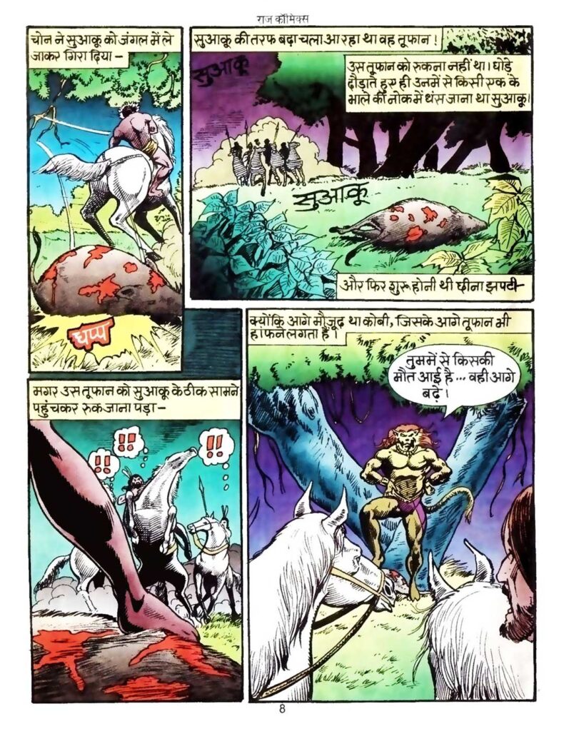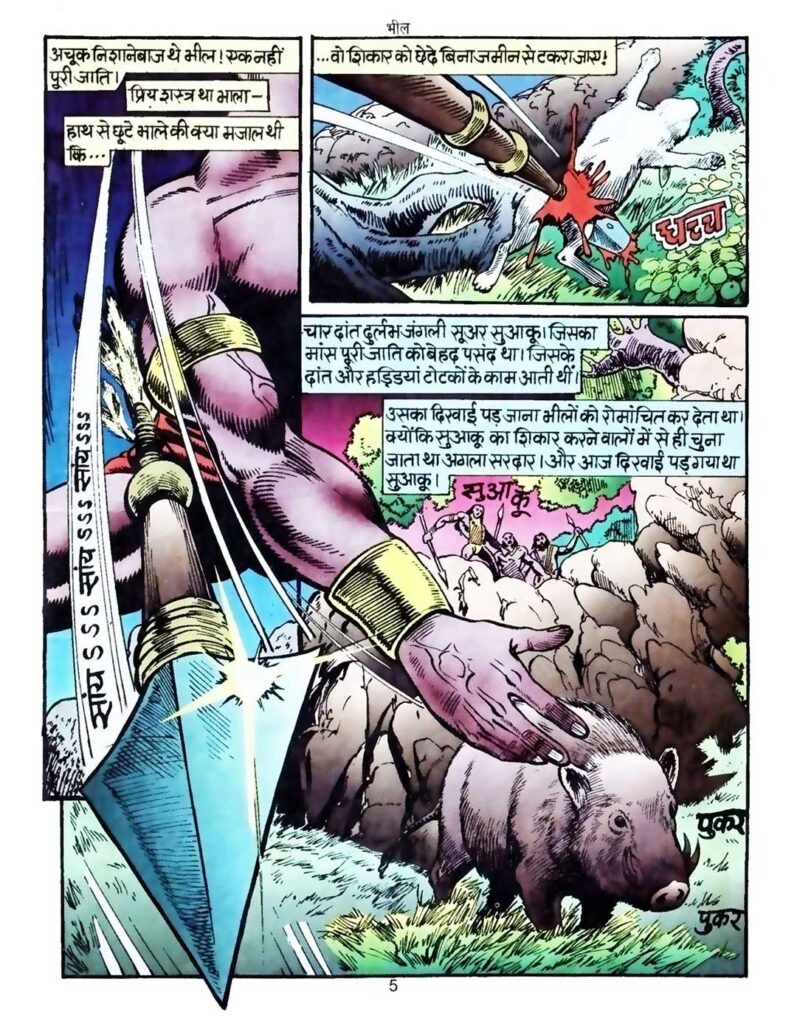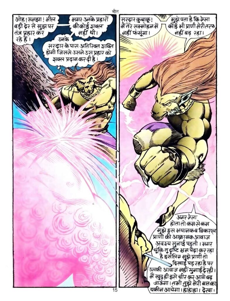 यहाँ कोबी का अहंकार और भील योद्धाओं का स्वाभिमान आमने-सामने आ जाता है। कोबी और भीलों के बीच यह टकराव सिर्फ ताकत का नहीं है, बल्कि दो अलग-अलग सोच और जंगल पर अधिकार के दावों का संघर्ष है। भील योद्धा अपने घोड़ों और भालों के साथ कोबी पर हमला करते हैं, लेकिन कोबी की दैवीय शक्ति और उसकी तेज फुर्ती उन्हें पल भर में परास्त कर देती है। चित्रकार धीरज वर्मा ने इन युद्ध दृश्यों को इतनी खूबसूरती से बनाया है कि पाठक को भालों की आवाज और घोड़ों की टापें जैसे सचमुच सुनाई देने लगती हैं।