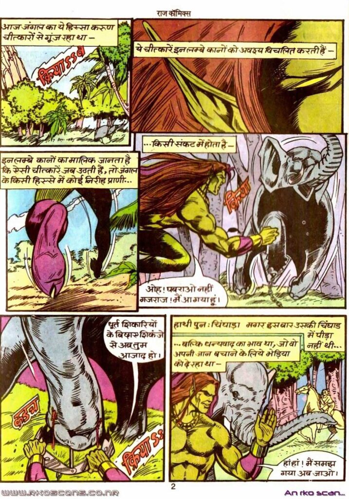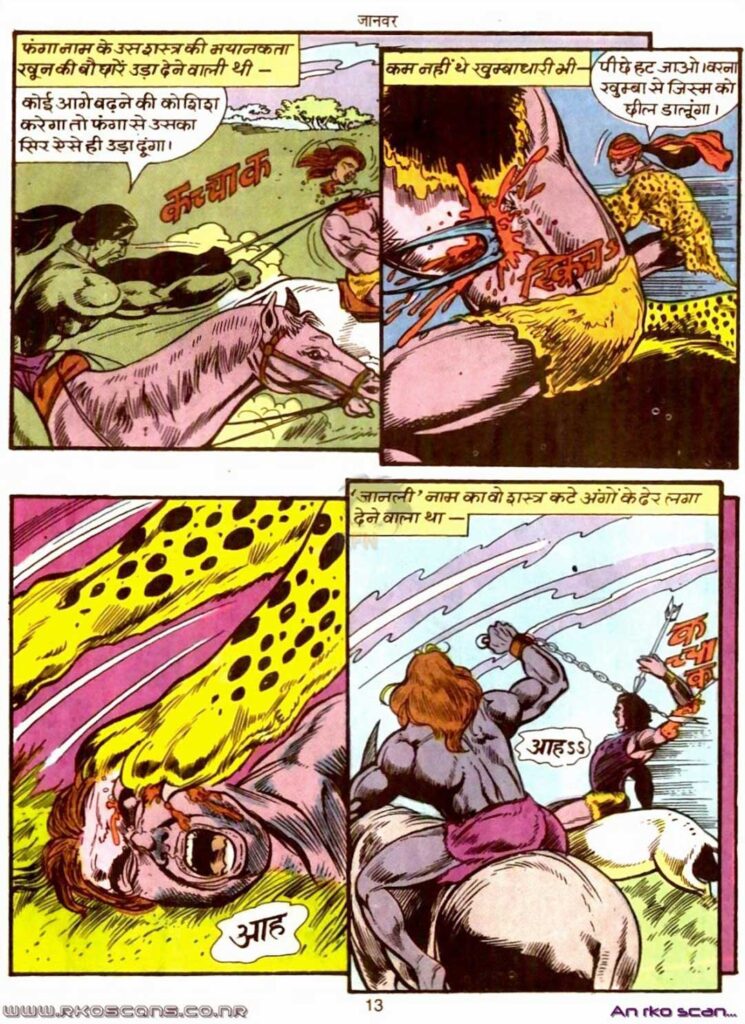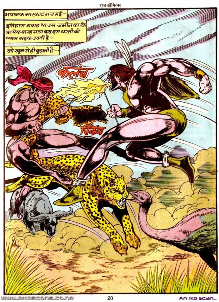 The middle part of the story is full of tribal battles and fierce violence. Dheeraj Verma’s art is visible here in its full impact. Warriors from different tribes ride strange and powerful animals such as ostriches, leopards, and rhinos, and attack each other. Fighting scenes with dangerous weapons such as ‘fung,’ ‘khimb,’ and ‘janli’ become very sharp and effective. Body parts are shown being cut in many places, which reflects the outspoken style of the comics of that period.
