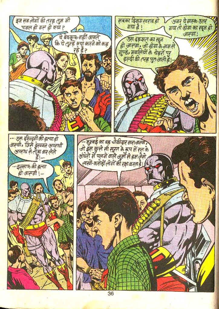 Doga is often called the ‘Protector of Mumbai’, and this comic shows the dark underworld of that city very effectively. Just as the city itself comes across as a character in film noir, the streets of Mumbai here deepen Doga’s loneliness and confusion. Small gutters and dark corners hidden among skyscrapers become dens of crime. The difference between Red Button’s modern lab and the museum’s security arrangements shows two different faces of the city. Doga tries to balance justice between these differences.