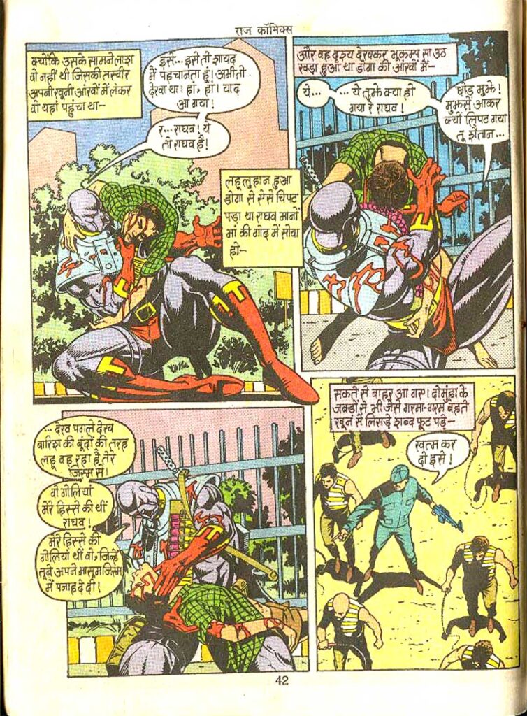 Doga asking himself the question — “Who am I? Am I really a dog?” — connects the reader to the hero’s weakest and most sensitive moment. It is extremely interesting to see how a great warrior struggles for his identity. Wahi keeps the dialogues simple but effective, perfectly in tune with Doga’s stern personality. The climax of the story, where Doga regains his memory, is written in a highly dramatic and exciting way. The ‘short circuit’ attacking Doga’s mind again and the nostalgia coming back like lightning proves to be a true masterstroke.