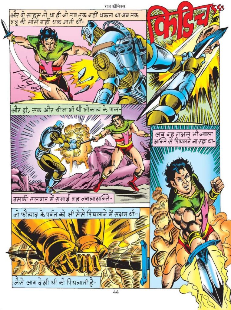 Bhokal: In this comic, Bhokal is seen as a just and powerful warrior, as always. His true greatness is revealed when he decides to save the life of his archenemy (Steel, whom he had until then thought to be the enemy). His ‘Jwala Shakti’ and his devotion towards ‘Mahaguru’ give him the status of a divine hero.