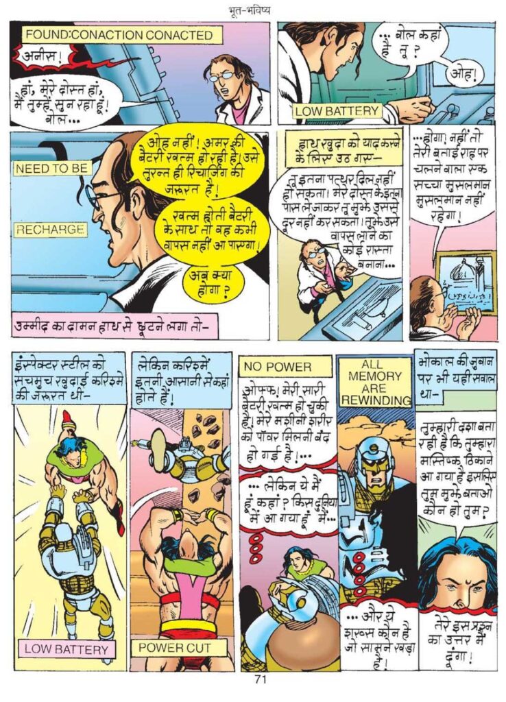 Bhokal recognizes the power unit behind Steel’s back and helps recharge it (as Steel points to it by mustering his last strength). Steel understands the whole truth as soon as his memory returns. He immediately arrests Kaal Kundli. Finally, Dr. Anees manages to pull Steel back into the future with his technical understanding. That last farewell and mutual respect between Bhokal and Steel leave a deep impression on the reader’s heart.