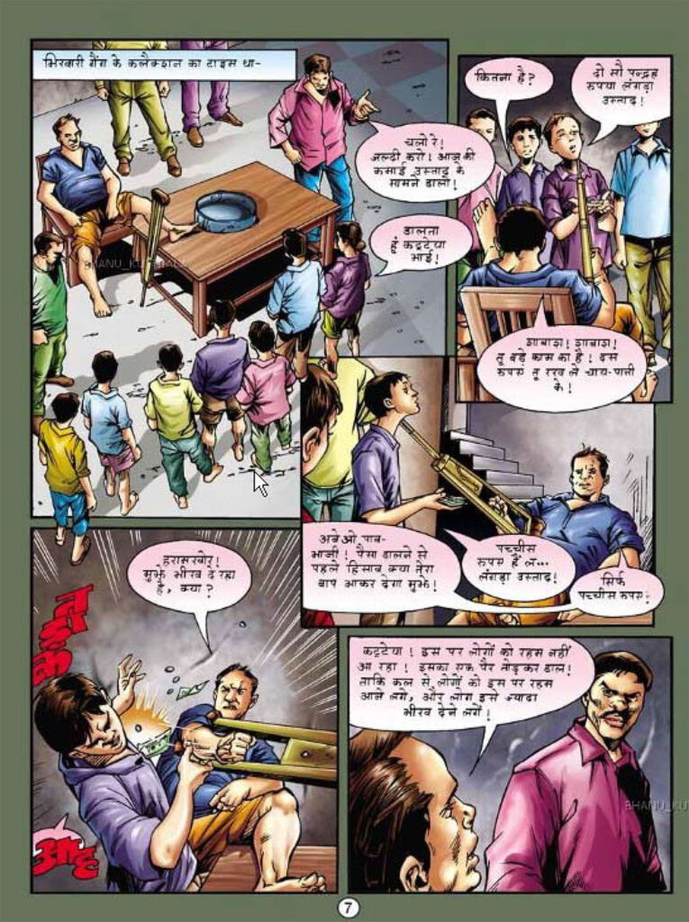 The comics show how small children are kidnapped, maimed, and forced to beg. This is the bitter reality of big cities.