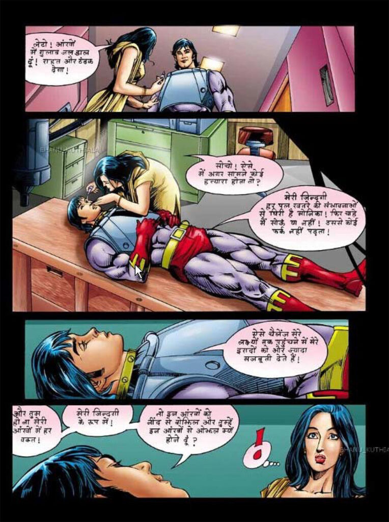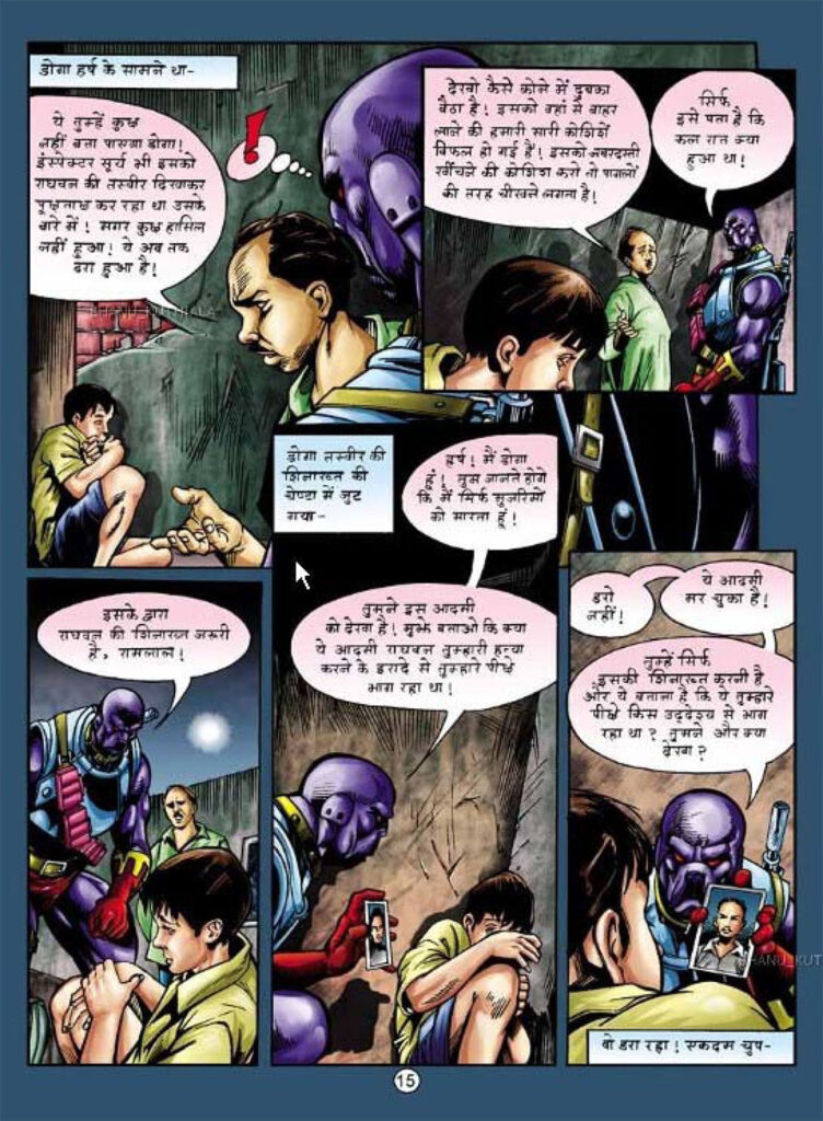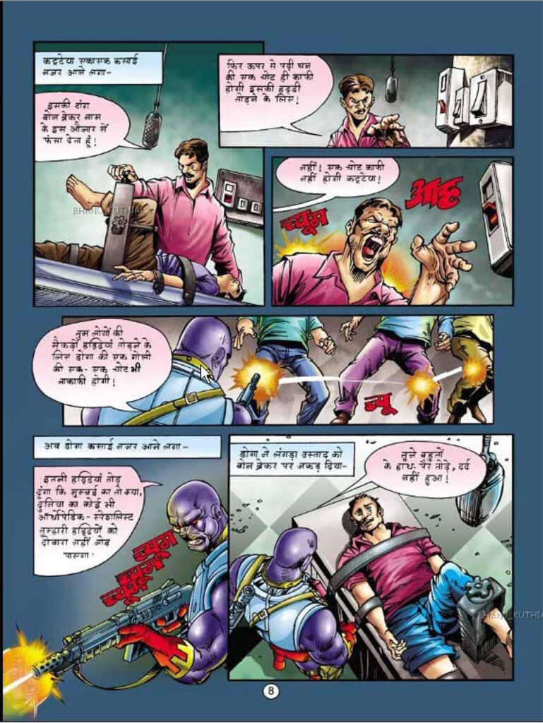 Doga’s double face comes across very beautifully in this comics. On one hand he is ‘Suraj’—who understands the pain of children, takes out his anger in the gym and keeps rejecting Monica’s love because he feels that his life is just for the mission. On the other hand he is ‘Doga’—who has forgotten the meaning of mercy.