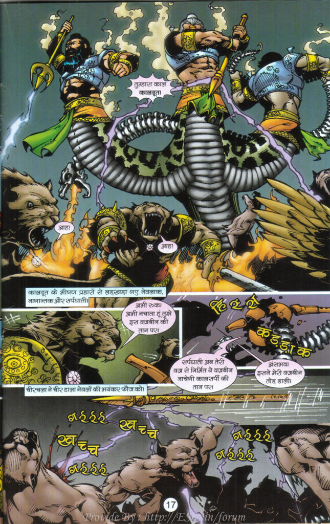 On the battlefield, Mahavishya strikes his enemies like death itself using the powers of the Kalakoot poison. In the initial battle, he overpowers the three villains. But the enemies are also fully prepared. Sarpghati plays a tune on his flute that blocks the circulation of Kalakoot poison within Mahavishya’s body. This is a brilliant device, presenting the deep connection between the ‘flute’ and ‘snake’ from Indian folklore in a new, destructive form. Without his greatest power, Mahavishya becomes weak, and the three enemies join forces to injure him.