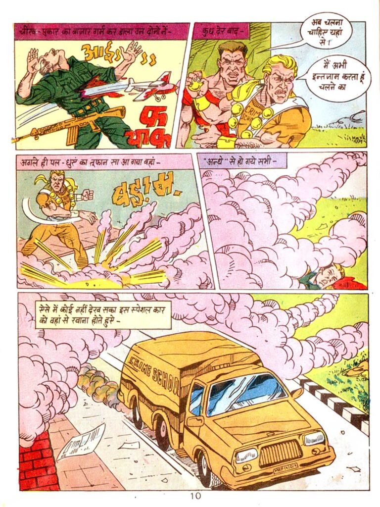 The final part of the comic moves at a very fast pace. The head of the Crime School learns that Professor Verma is still alive and has prepared a protector. ‘Jahaj’ and ‘Golilo’ are sent to attack the professor’s farmhouse.
