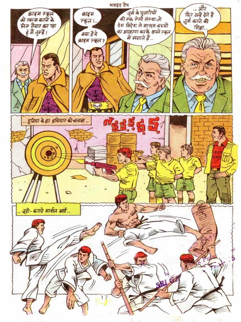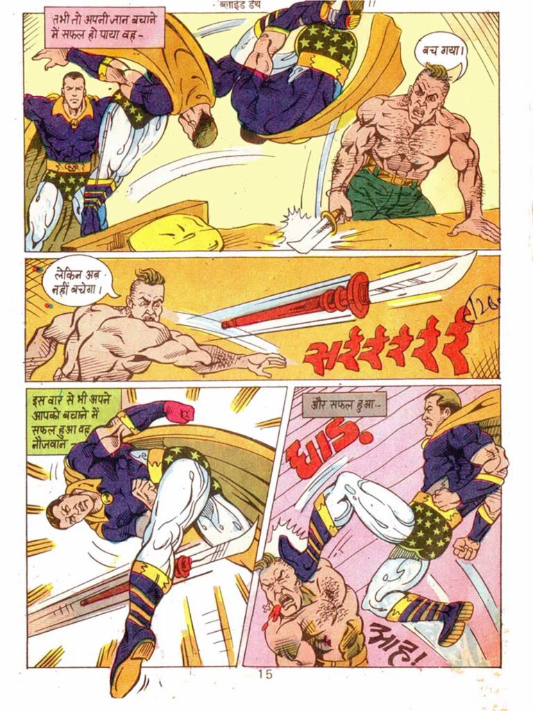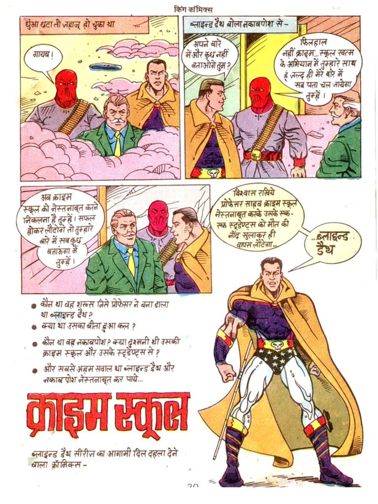 Dilip Choubey’s artwork is typical of the 90s comic style. Blind Death’s costume—his yellow cape, purple suit, and goggles—gives him a mysterious and striking appearance.