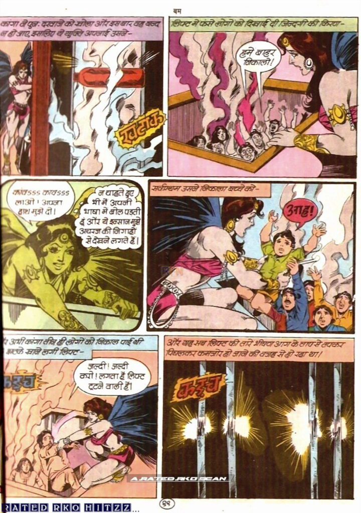 Art (Kadam Studio): The artwork of Kadam Studio is dynamic and effective for its era. The scenes of fire, blasts (bhadam, dhaak, bhadak), and stampede have been depicted very vividly. The first panel of dogs encircling the car and the scenes of Kanga taking off are memorable. Fear and stress (such as Mr. Swami’s sweat) are perfectly depicted on the faces of the characters.