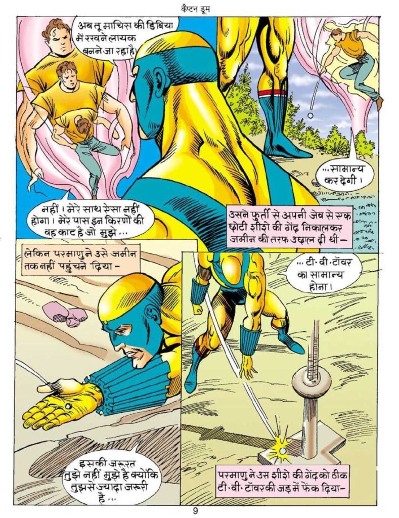कहानी का क्लाइमेक्स एक स्पेस सेंटर में सेट है। यहाँ परमाणु को खुद छोटा होना पड़ता है ताकि वह कैप्टन डूम के कंट्रोल रूम तक पहुँच सके। लेकिन एक ‘नन्हे’ इंसान के लिए दुनिया कितनी खतरनाक हो सकती है, यह इन पन्नों में बहुत अच्छे से दिखाया गया है।
