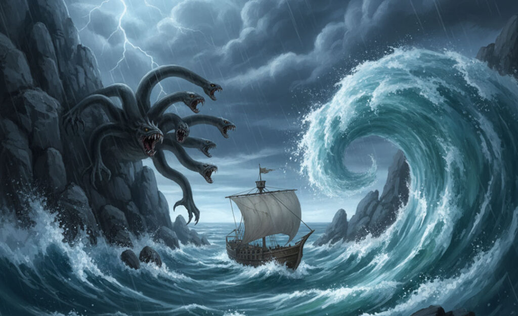 Now the journey brought them to another dangerous place, between two sea demons. On one side was Scilla, the six-headed fearsome monstrosity, and on the other was Khairibdis, a giant water vortex that could swallow up an entire ship. This place was extremely narrow and Odysseus had a very difficult choice. He followed the advice of Cerci and Teresius and decided to pass by Scilla instead of Khairibdis. There was bound to be loss, but at least more lives could have been saved. As their ship passed by Scilla, he drew six of his heads and swallowed six of Odysseus’ companions. This grief was heavy, but everyone else managed to escape the whirlpool of Khairibdis and overtake it.