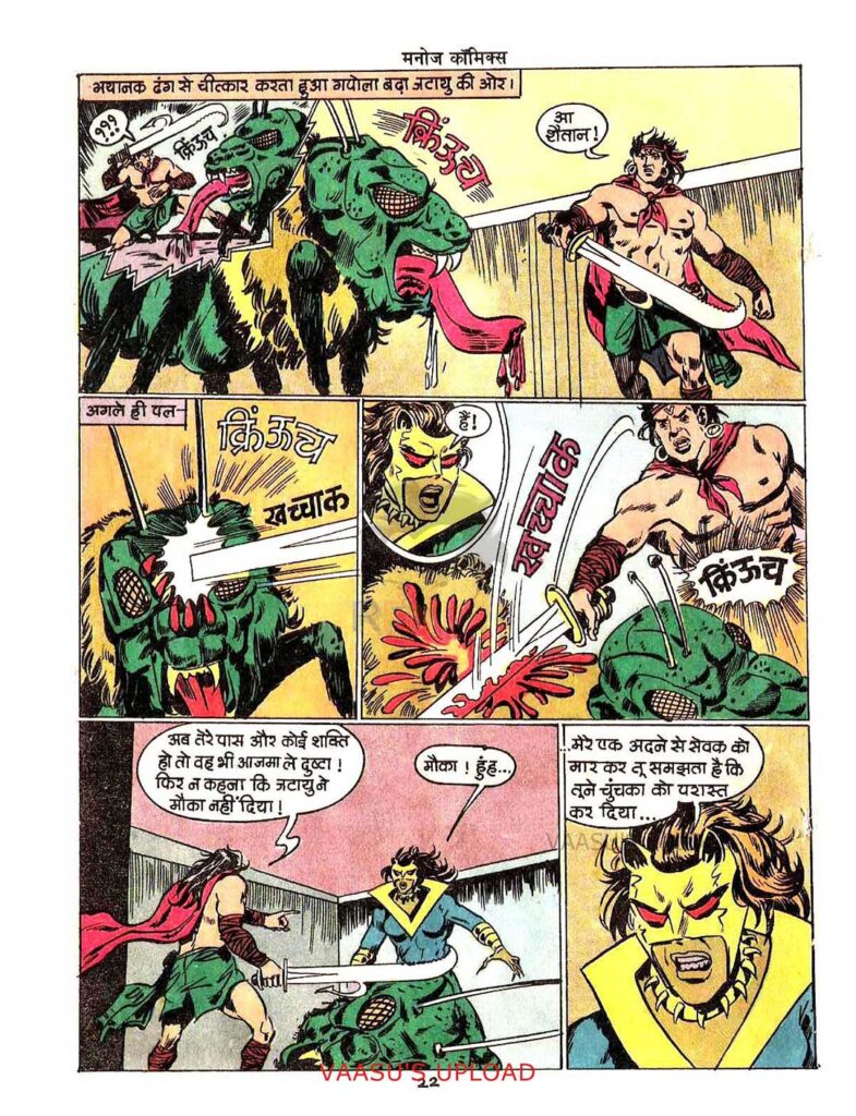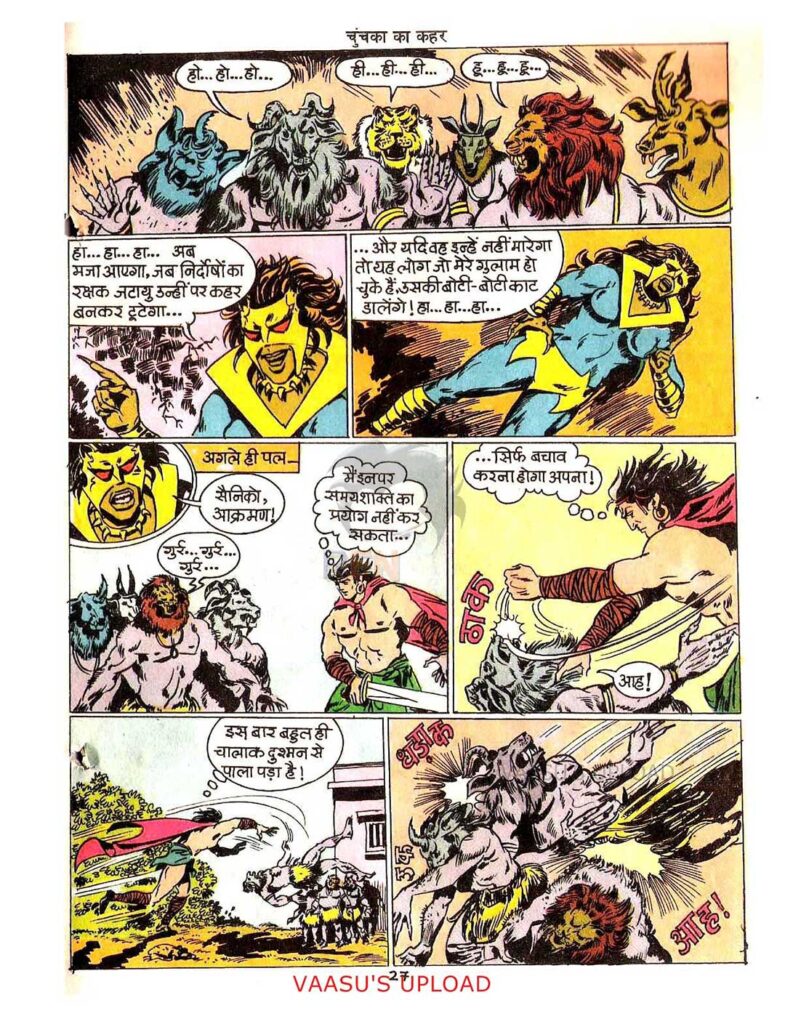 As much as the author contributes to the success of “Chunchaka Ka Kahar”, its illustrator A.M.G. also plays an equally important role. The comic’s illustrations are very lively, especially the terrifying look of the sorceress Chunchaka; her use of colors in her riding and fighting scenes is praiseworthy. The fire-wielding power of Goomand and the way the water streams emerging from Jatayu’s sword are depicted were magnificent for that time. The dialogues are short but effective, maintaining the pace of the story. Papinder Juneja has tried to convey through Jatayu that a true hero is not just the one who defeats enemies, but the one who understands the pain of others and puts everything at stake to protect them.