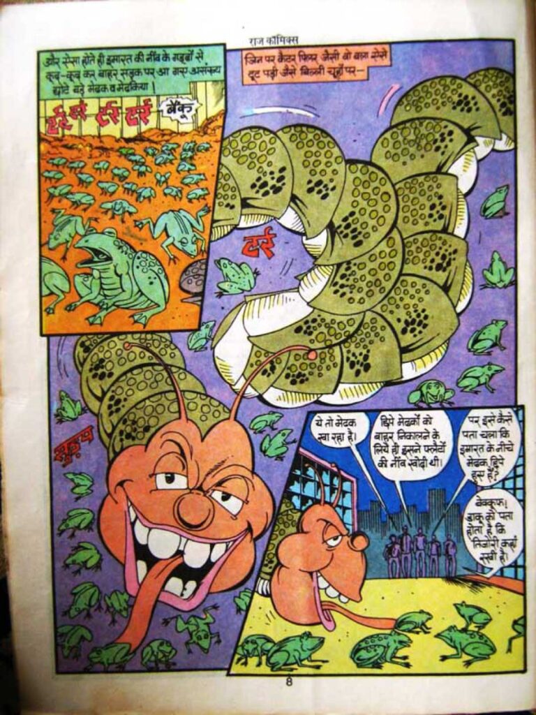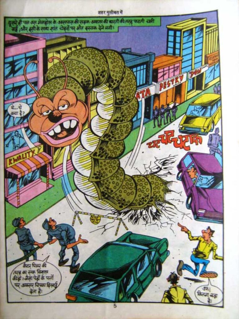 Dilip Choubey’s artwork is the life of this comic. The special identity of Raj Comics in the nineties was the use of bright and bold colors, wide backgrounds, and clearly visible expressions on the faces of the characters, all of which are visible here in their best form. The way the body segments of Todskhor are illustrated gives it both a machine-like and organism-like appearance simultaneously. The scenes of buildings collapsing and the panels used to show the chaos in the city streets draw the reader into the story.