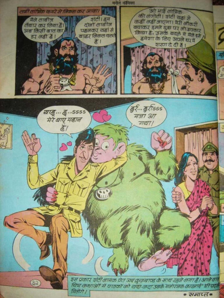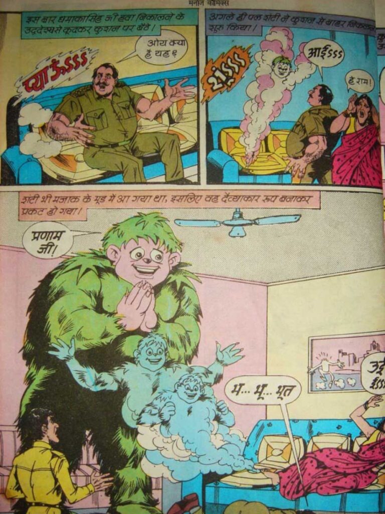 This comic is illustrated by ‘Kadam Studio’ (Vijay Kadam, Durga Kadam). Manoj Comics’ art style was a little less realistic but more emotional than Raj Comics. Among the characters’ faces, Crookbond’s long nose and funny face, Dhamaka Singh’s mustache, and his angry gestures were very much liked by the children. Shanti’s design also makes him look green and cute, giving him the appearance of a ‘friendly ghost’. Bright colors have been used in the comic, which look quite attractive according to the printing technology of that time.