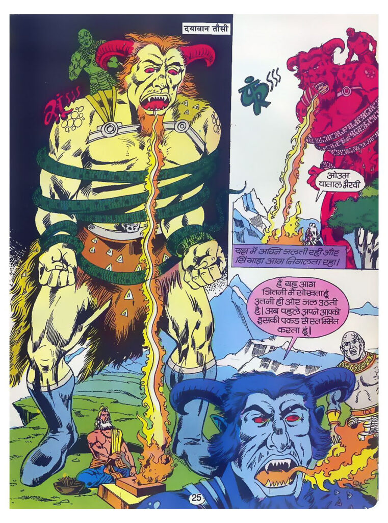 It is here that the title of the story ‘Dayawan Tausi’ becomes meaningful. Despite his personal quest and promise to his wife, Tausi cannot remain silent after seeing the atrocities being committed on an innocent ascetic. He comes forward to protect Dharma and confronts Singada’s entire army alone. From here, the comic enters a long and detailed sequence of action and feats. Tausi makes a wonderful display of his wishful powers, physical strength, and combat skills. He alone outweighs hundreds of demons.