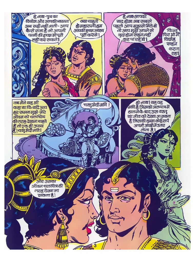 Writer Rituraj’s writing is the soul of this comic. The dialogues are written in pure and literary Hindi, giving a completely different experience from today’s colloquial comics. The use of words like ‘Prananath’, ‘Vatsa’, ‘Yagyagni’, ‘Dushta’, ‘Tapasya’ provides a mythological and serious atmosphere to the story. The dialogues are short, pithy, and well-suited to the characters. The pace of the story is fast; it starts with emotional scenes and quickly moves towards action and adventure, keeping readers engaged till the end.