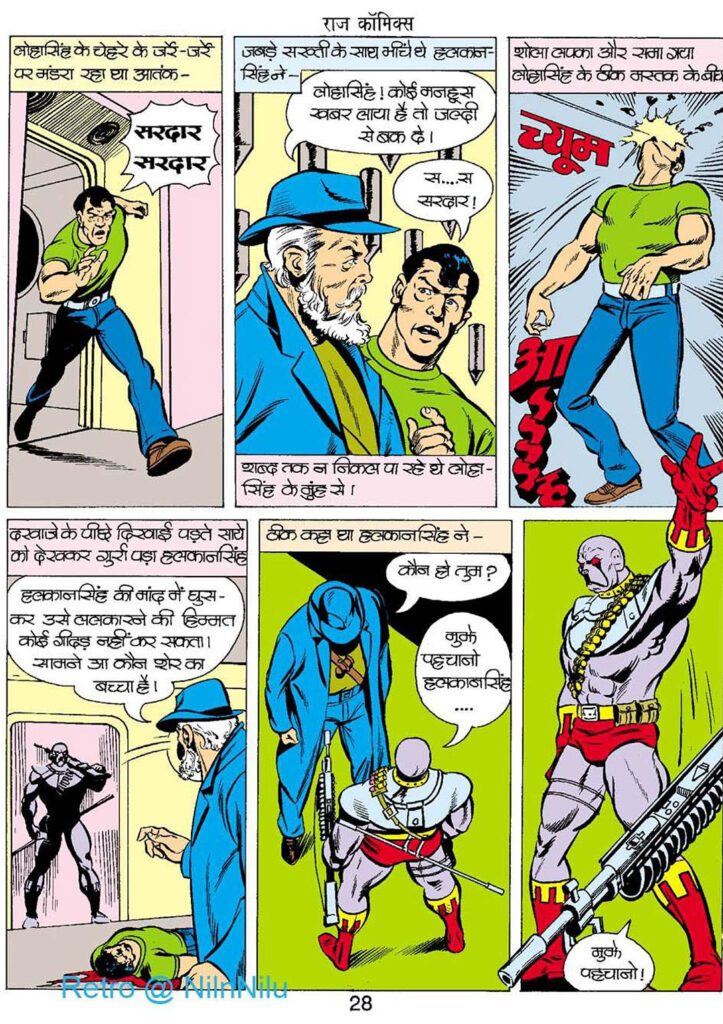 Manu’s artwork is the biggest strength of this comic. The genre that became the hallmark of 90s Raj Comics is fully visible here. The choice of colors, especially Doga’s purple and red suit, looks very effective. The scenes of bloodshed and gunfire are so finely drawn that the reader feels himself standing amid that tension and violence.