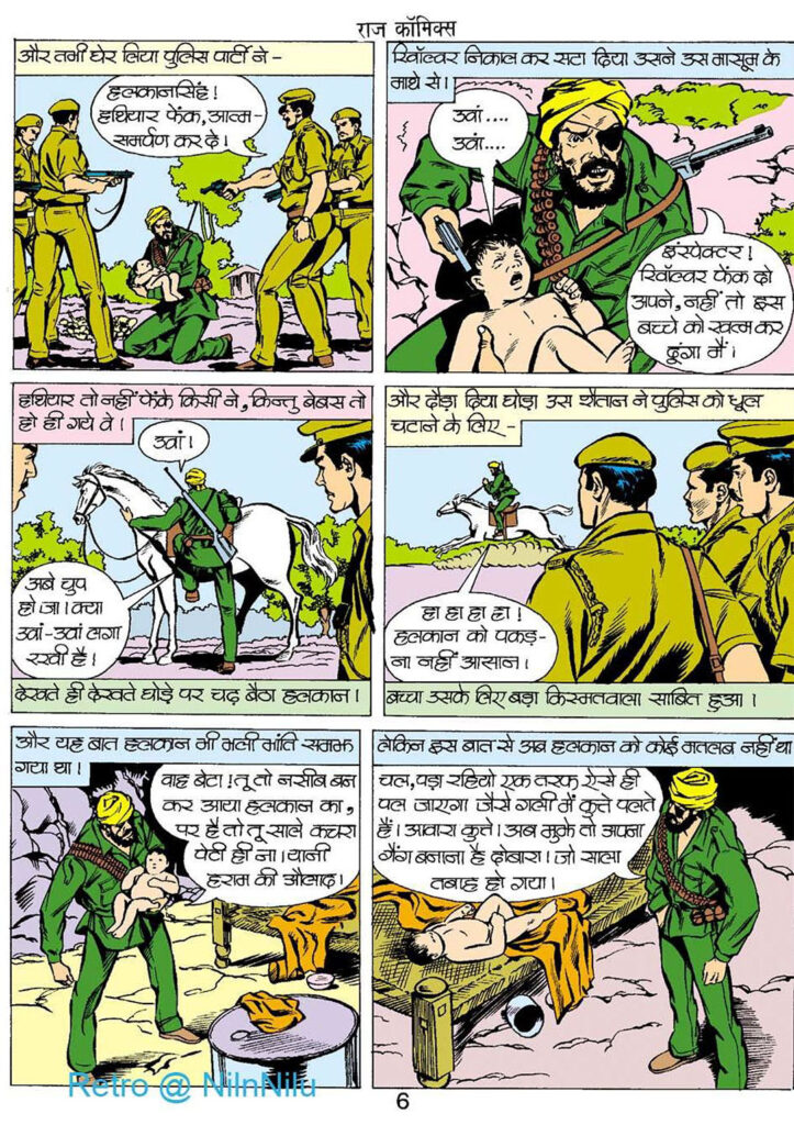 हलकान सिंह और उसका गिरोह, जिसमें जागीरा और अन्य लोग शामिल हैं, निहत्थे यात्रियों को बेरहमी से मार डालते हैं। वे सिर्फ़ हत्या ही नहीं करते, बल्कि लाशों को लूटते भी हैं—किसी मरी हुई औरत की उंगली काटकर अंगूठी निकालना और किसी शव के सोने के दाँत पत्थर से तोड़कर निकाल लेना। ये दृश्य पाठकों के मन में हलकान सिंह के लिए गहरी नफरत भर देते हैं और डोगा के आने वाले बदले को सही ठहराते हैं। वह छोटा बच्चा यह सब अपनी आँखों से देख रहा था, और उसी वक्त उसके अंदर नफरत और गुस्से की आग जल चुकी थी।