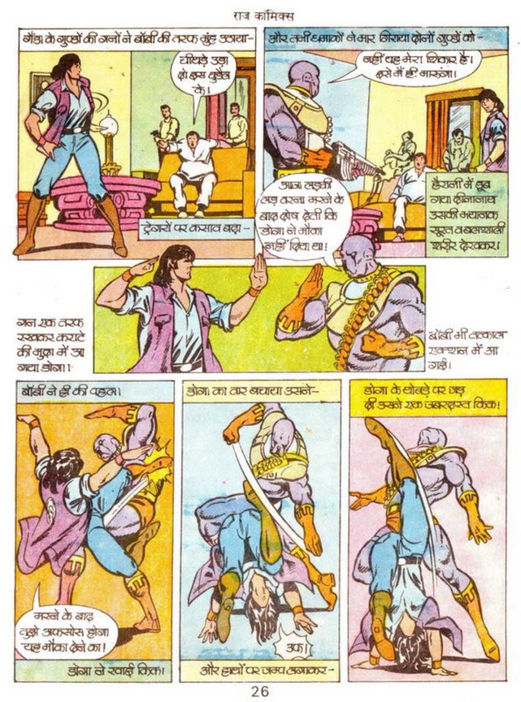 Doga has always been controversial because he does not believe in law but in justice. Doga in “Gainda” is a nightmare for the defenders of the law. He does not believe in capturing the villain, but in eliminating him. His fight with wrestlers Dumri and Chakubaz Kaku is the culmination of the action. The way Doga kills Kaku with electric wires gives the scene goosebumps. No mercy in Doga’s blows; those who can burn others do not deserve any sympathy. His ‘dog-justice’ gives a strange comfort to the readers because the law is not able to give these criminals the punishment that Doga gives.