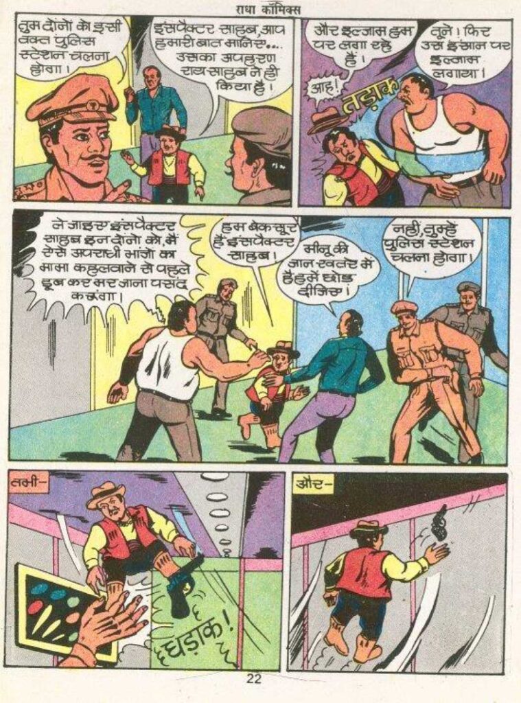 The middle part of the story is full of action and adventure. The fake Rai Saheb, who is actually a smuggler named ‘Bali’, tries to get Meenu out of the way through his goons, ‘Rak’ and ‘Dar’. In one scene, Meenu is thrown from a bridge into the river, but here Havildar Hitler’s wife, the spy’s aunt, bravely saves her life. This scene becomes a small but effective example of women empowerment in the comics of that period.