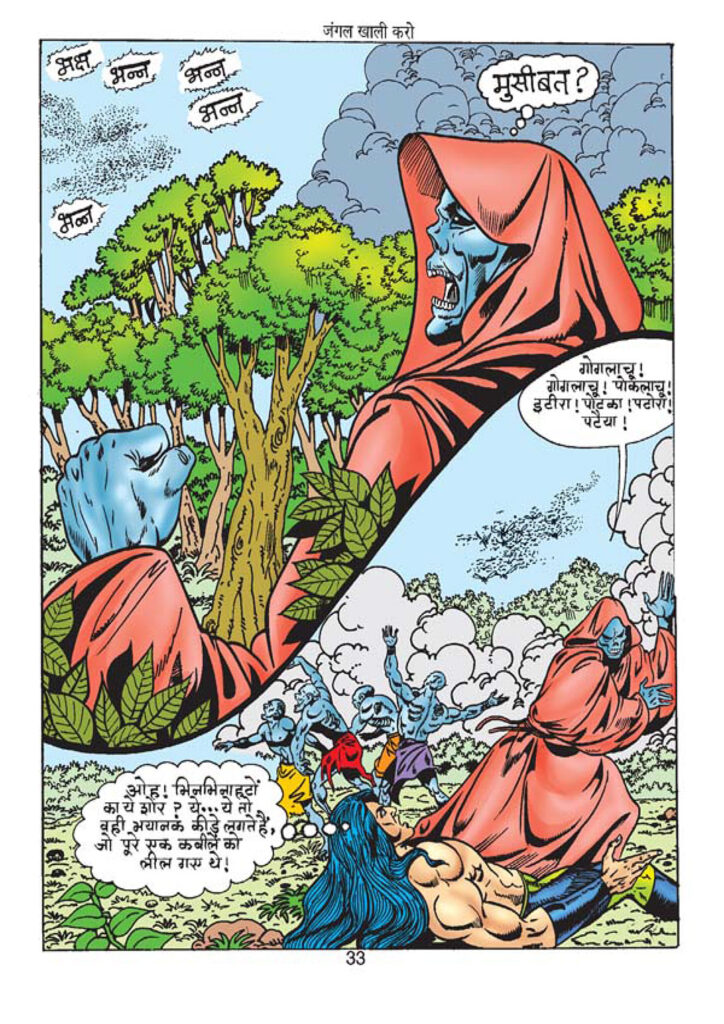 In the final panel, Bheriya and Kobi (now back in his true, dreaded form) stand together before the giant Saddu-demon, and the battle is yet to come.