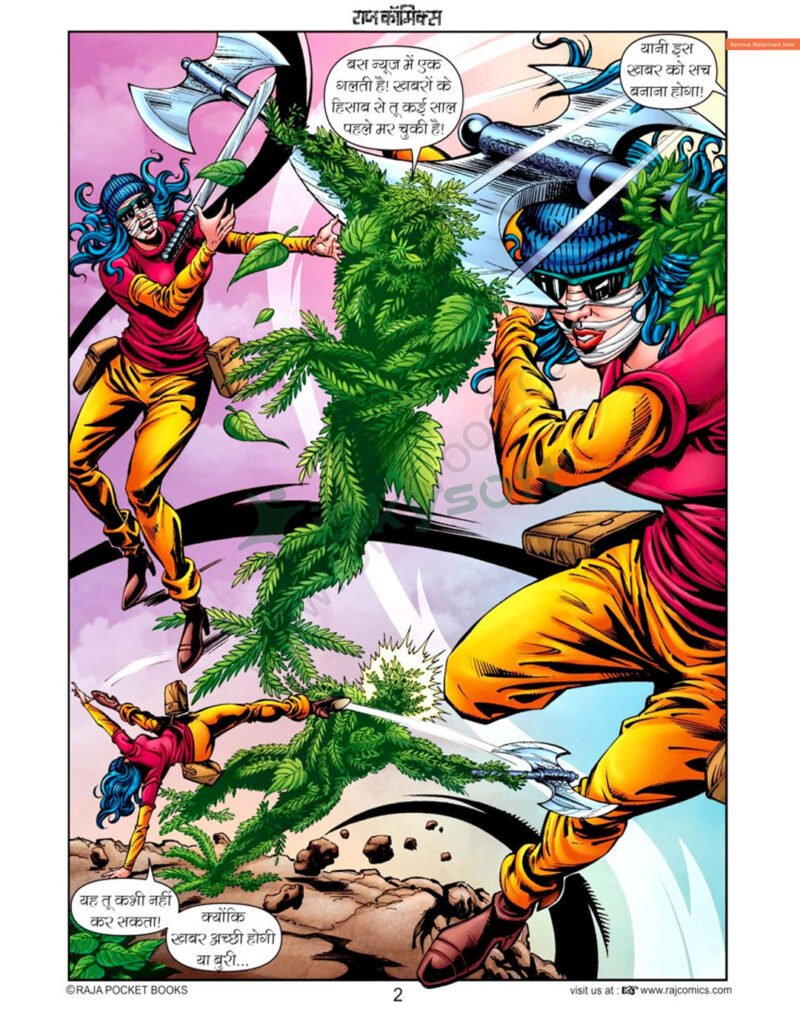 In front stands a strange enemy—who looks made of leaves and vines and who has a huge mechanical axe in his hand. This entire scene shows the special world of Raj Comics where the mix of science and fantasy comes out in the most fun form. Radha’s avoidance of that big axe and deceiving that demonic enemy clearly shows that even though she has been missing for years, her ability and training have not diminished at all.