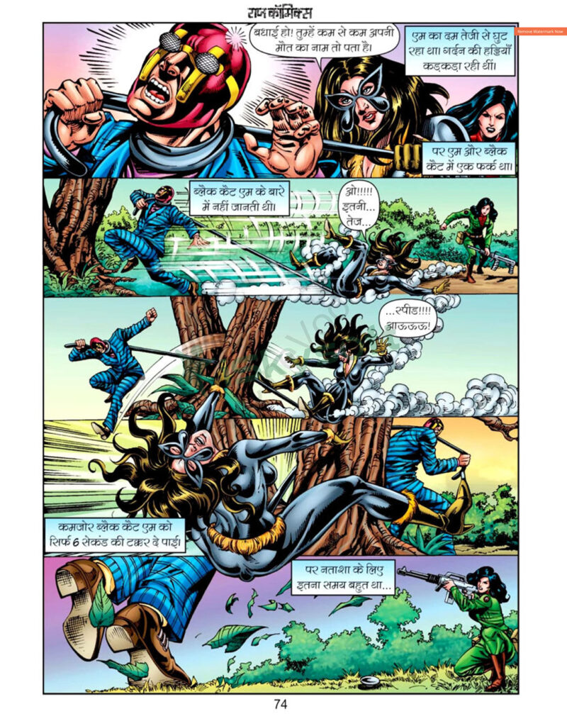 Finally, the color combination, attributed to Sunil Dasturia and others, is very vibrant; the harmony of green and brown colors used in flashbacks/jungle scenes and dark and bright colors in action scenes effectively establishes the atmosphere of the comics (Mood).