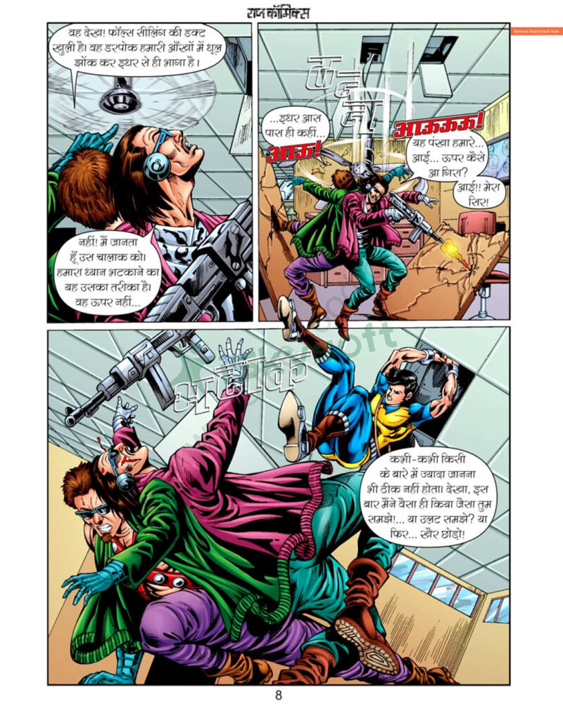 Moreover, Sinha’s script is extremely tight; on pages 8 and 9, the scene of Dhruv disappearing and then suddenly attacking is written in such a way that it gives a cinematic feel, in which first the readers see the deviation from the villains’ perspective (Misdirection) and then the attack is revealed from Dhruv’s perspective.