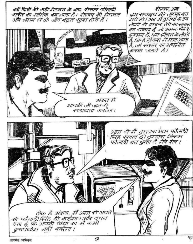 This is when the story introduces Dr. John Ka, who is a good and humanity-believing scientist. He works for peace and the well-being of humanity. Dr. John starts giving special training to a young man named Shekhar. Shekhar goes through rigorous physical and mental exercises. He is made adept in arts like judo-karate, horse riding, and shooting. Finally, Dr. John names him ‘Fouladi Singh’ and gives him many modern scientific instruments, which make him a true superhero.