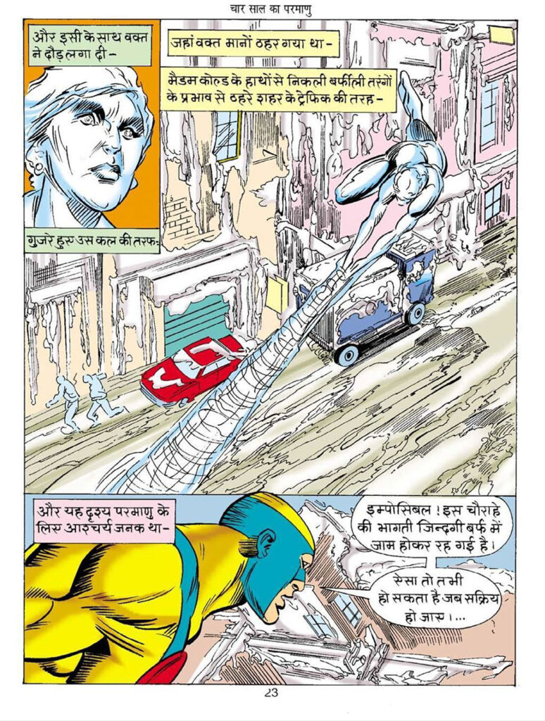 Suresh Degwal’s penciling and Vitthal Kamble’s inking make this comic very attractive to watch. The scene of the plane crash, the scene of Madame Cold freezing the entire city in ice, and Typhoon creating a terrible tornado of water—all these scenes are made in great detail and come alive before the eyes while reading. These scenes of action and devastation give a cinematic feel to the comic.