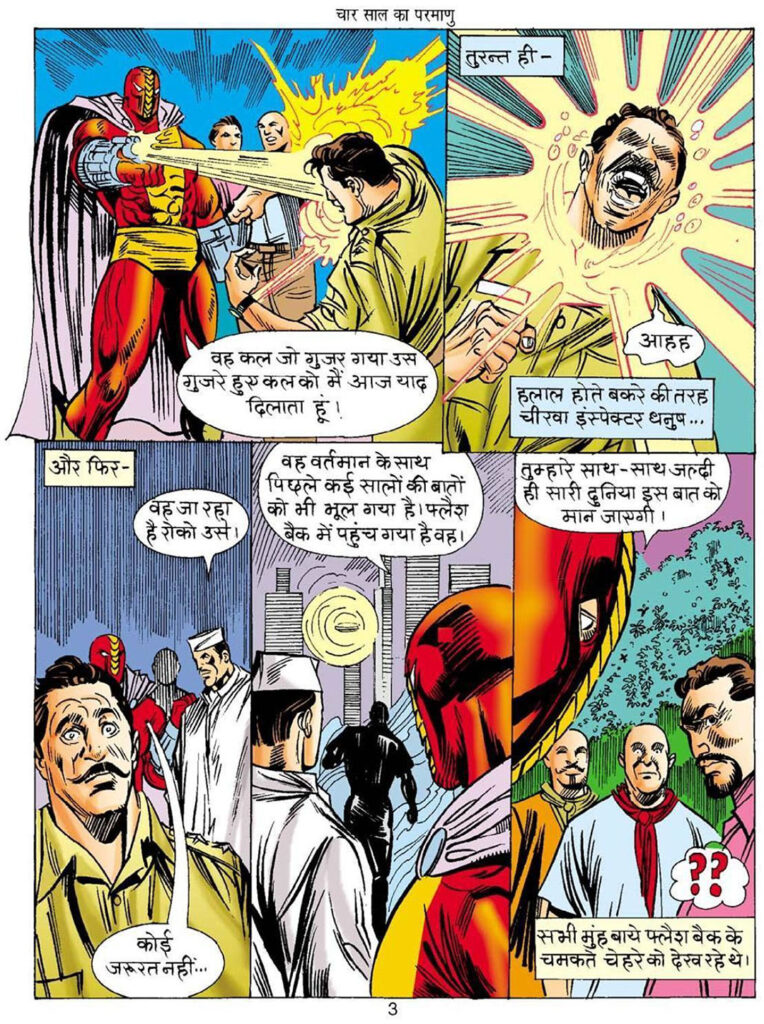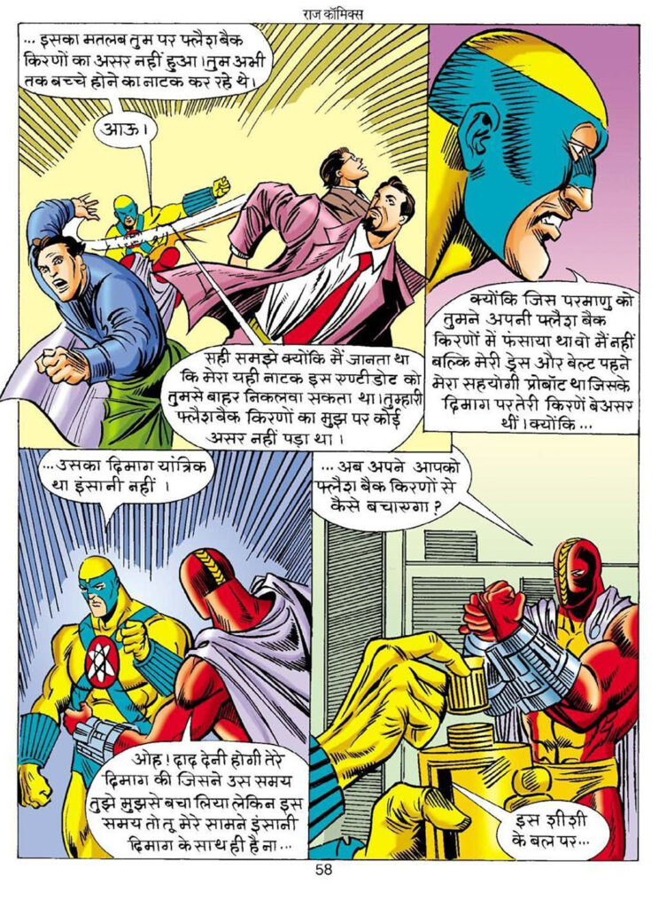 When Atom brings out his true trick, it’s a big “wow moment” for readers. The use of Probot is not new to Raj Comics readers, but the way it is used as a dummy here is commendable. Atom explains that it was his partner Probot wearing his dress and belt, whose mind was not affected by the rays because his mind was not human, but mechanical. This revelation foils the entire plan of Flash Back in a moment.