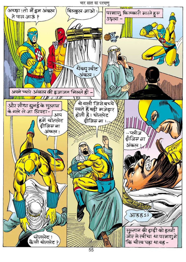 Becoming a child of Atom: The event this comic is named after comes to light near the climax. Flash Back releases his rays on Atom, claiming that Atom has now become a four-year-old child mentally. This scene is very interesting, where a powerful superhero is seen playing with toys, and mafia dons even start thinking of auctioning him.
