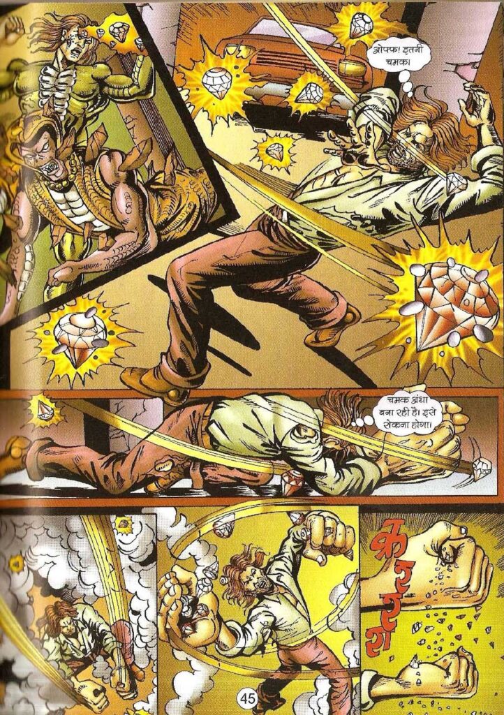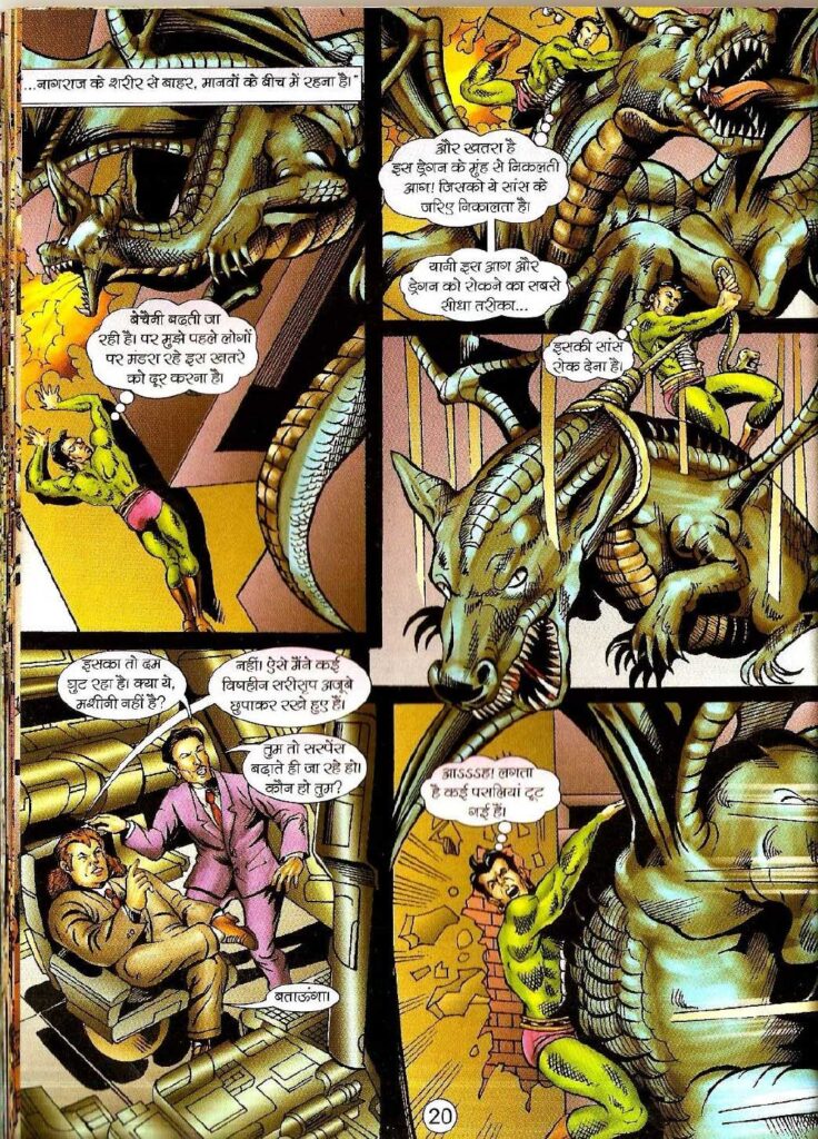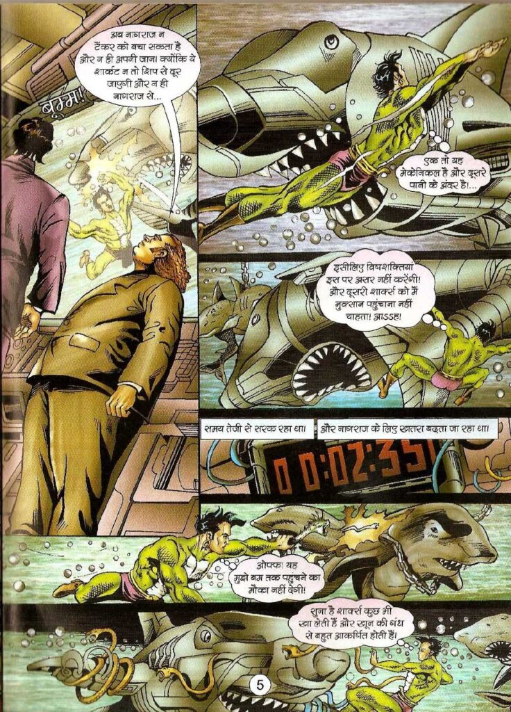 समुद्र के नीचे का दृश्य रोमांच को और बढ़ा देता है, जब नागराज को पता चलता है कि वह शार्क असली नहीं बल्कि ‘मैकेनिकल शार्क’ (Mechanical Sharks) हैं, जिनमें बम लगे हुए हैं। यहाँ अनुपम सिन्हा की कला सच में कमाल लगती है। पानी के अंदर के एक्शन दृश्यों में जो मूवमेंट दिखाया गया है, वह बहुत प्रभावशाली है। नागराज का उन बमों से भिड़ना और आखिर में उस रहस्यमयी ‘किंग’ की योजना को नाकाम करना यह साबित करता है कि नागराज को खत्म करना इतना आसान नहीं है। लेकिन यहाँ एक बड़ा सवाल बना रहता है—क्या वह सच में नागराज ही है?