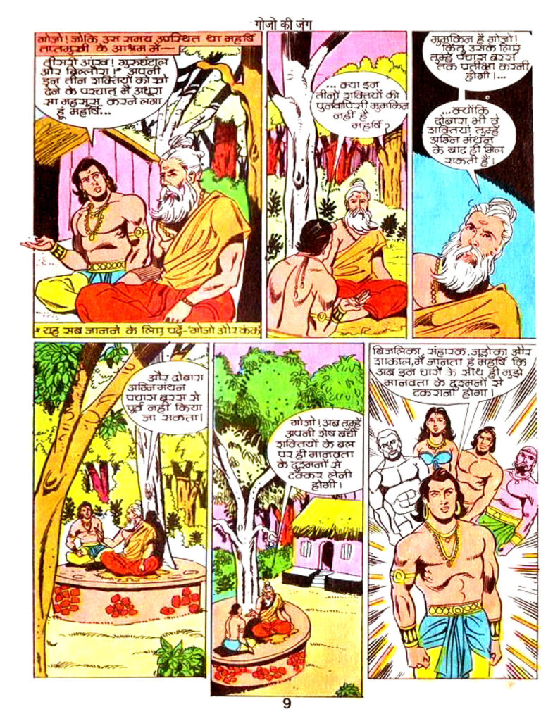 गोजो की विवशता और संघर्ष: कहानी का असली टर्निंग पॉइंट तब आता है जब हमारा हीरो, गोजो, सामने दिखता है। गोजो इस समय महर्षि तप्तमुखी के आश्रम में है और एक बड़े संकट में फंसा हुआ है। यहीं पता चलता है कि गोजो अपनी तीन सबसे बड़ी शक्तियां — ‘तीसरी आंख’, ‘गुरुघंटाल’ और ‘बिल्लौरा’ — खो चुका है। यह बात पाठकों के लिए भी झटका है, क्योंकि गोजो को हमेशा इन्हीं शक्तियों के साथ देखा गया है।