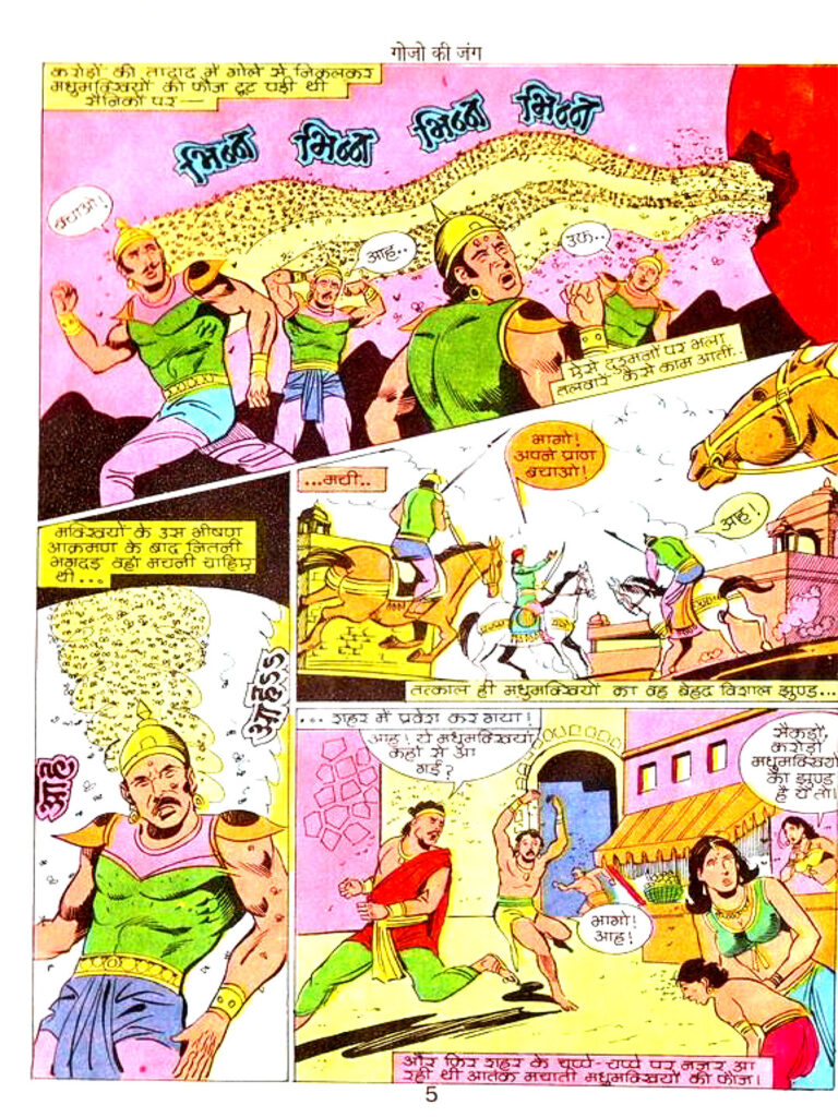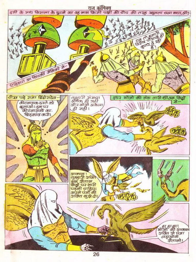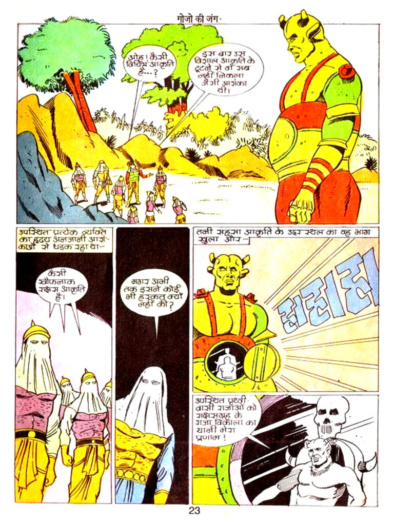 तकनीक बनाम आदिम शक्ति: जैसे-जैसे कहानी आगे बढ़ती है (खासकर बाद के पन्नों में), पता चलता है कि खतरा केवल जानवरों — यानी सांप और चींटियों — तक सीमित नहीं है। कहानी में बहुत बड़े रोबोटनुमा ढांचे और अलग-अलग रंगों वाले पत्थर भी आते हैं, जो मशीनों या राक्षसों का रूप लेते हैं और विनाश मचा देते हैं। यह फैंटेसी और साइंस-फिक्शन का शानदार मिश्रण है — और यही राज कॉमिक्स की खासियत भी रही है। गोजो को इन जादुई और आधुनिक दोनों तरह के दुश्मनों से अपनी सीमित ताकत के साथ लड़ना पड़ता है।
