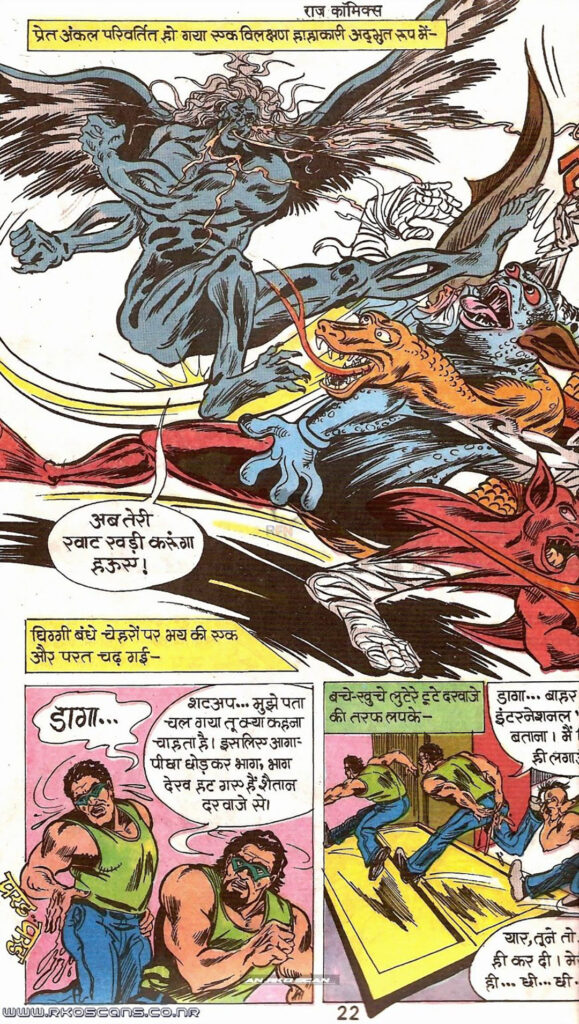 विनोद कुमार का चित्रांकन इस कॉमिक्स की सबसे बड़ी ताकत है, जो 90 के दशक की क्लासिक स्टाइल और पात्रों की खास बनावट को पूरी तरह जिंदा कर देता है। हऊआ का डिजाइन इतना डरावना और डिटेल्ड है कि ममी की पट्टियों से लेकर अजगर के स्केल्स और चमगादड़ के झिल्लीदार पंखों तक, हर छोटी चीज़ पर खास ध्यान दिया गया है। शुरुआती पन्नों में हिंसा और गोरे (Gore) को जिस बेबाकी से दिखाया गया है, जहाँ हऊआ इंसानों का शिकार करता है, वह इसे सिर्फ बच्चों की कॉमिक्स नहीं रहने देता, बल्कि वयस्क पाठकों के लिए एक डार्क फैंटेसी का रूप दे देता है। इसके साथ ही, कलाकारों ने पात्रों के चेहरे के भावों पर भी बेहतरीन काम किया है, जिससे जैकब की छिपी हुई उदासी और प्रेताली की आँखों में चमकता लालच बिना किसी संवाद के ही पाठकों तक पहुँच जाता है।