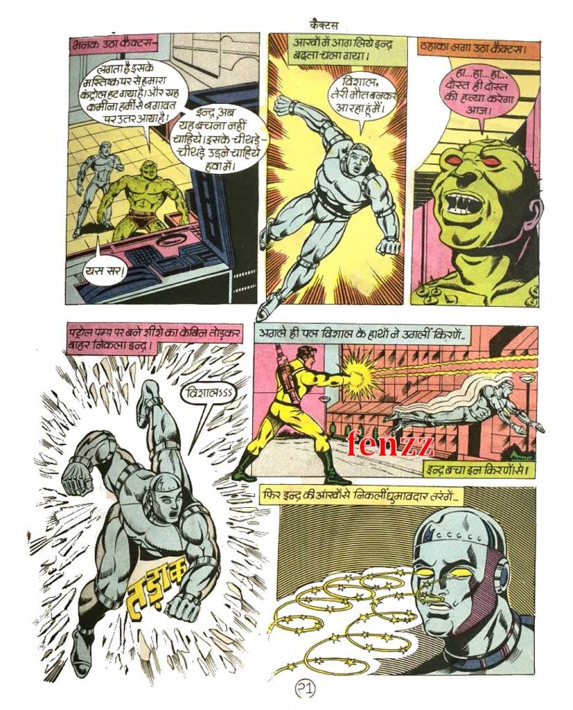 But as soon as we reach the laboratory, the story takes a tremendous turn. During the conversation, as Indra and Professor Vishal begin to doubt the Home Minister’s words, the man reveals his true form. He is not a minister, but a creepy, thorny demon named Cactus. Cactus, with the help of his dangerous nerve gas and webbed rays, makes both Indra and Professor Vishal unconscious. It is here that, for the first time, readers encounter a villain who is not only powerful but also very scary in appearance. His body is filled with sharp thorns, just like a cactus plant.