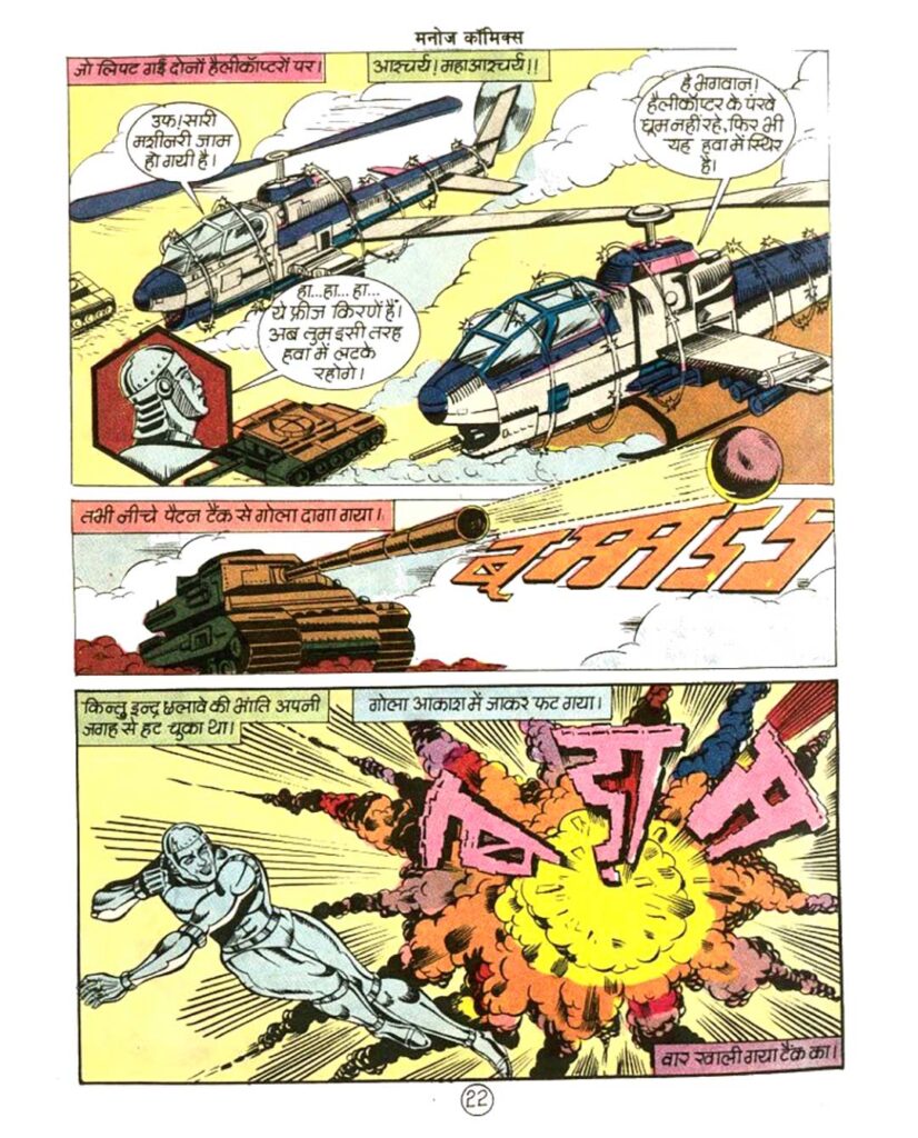 But as the story moves towards its climax, the truth comes out. All this is a well-planned strategy by Indra and Professor Vishal, so that they can reach the secret hideout of Mahakal. Indra deliberately convinces Cactus and Mahakal that he is now under their control. Indra shows his true strength in the final confrontation. He jams the attacking tanks and helicopters in mid-air with his freeze rays, rendering all the enemy’s plans useless.